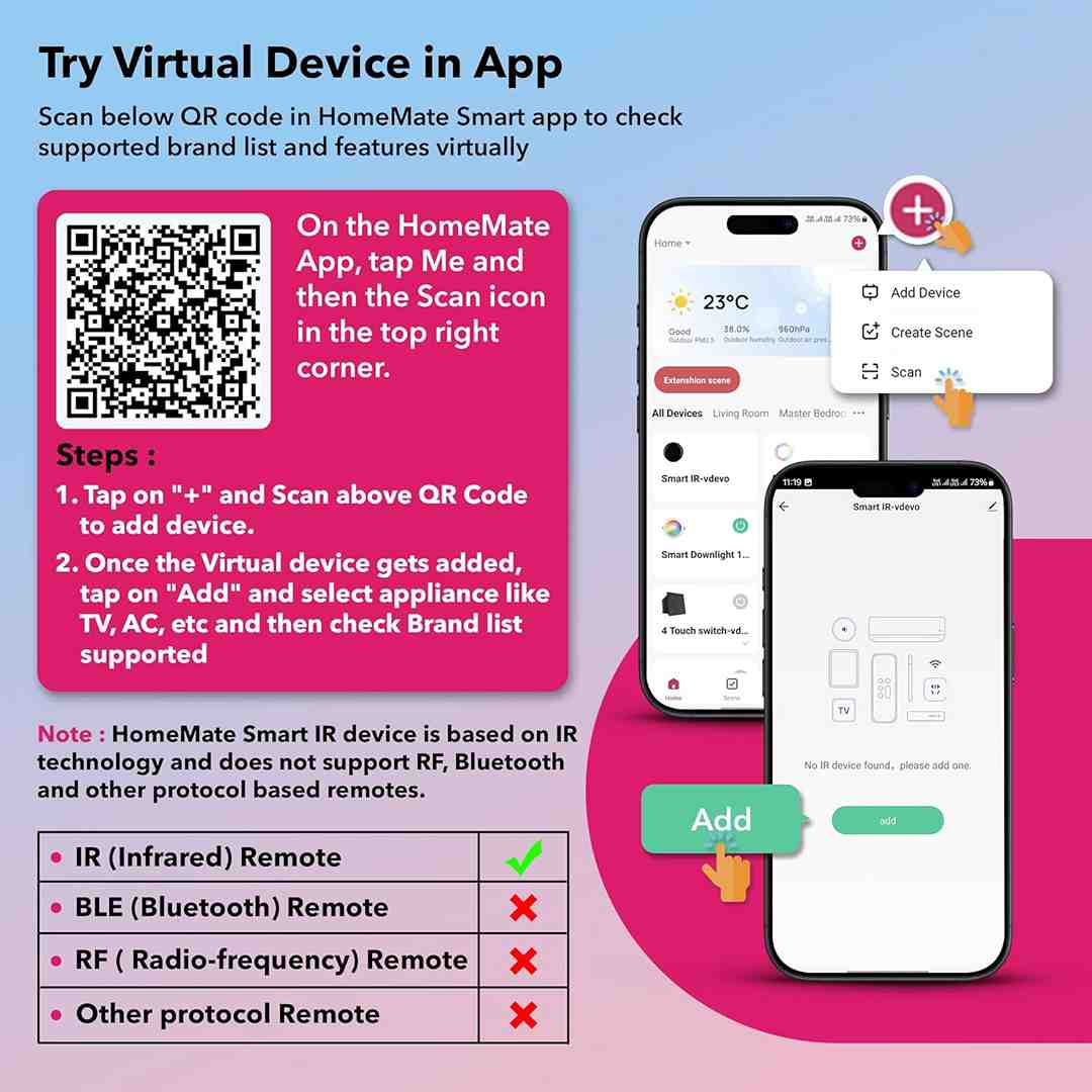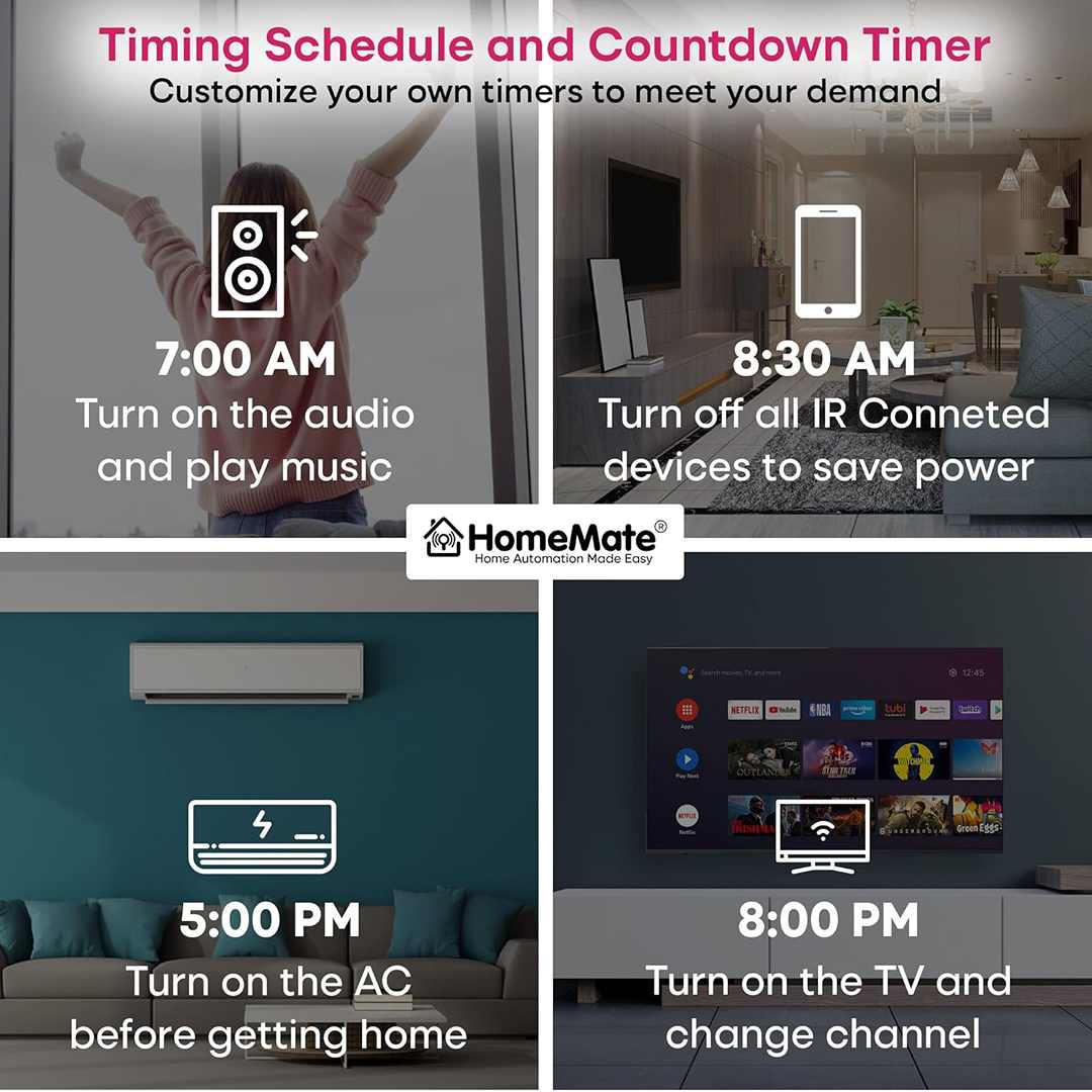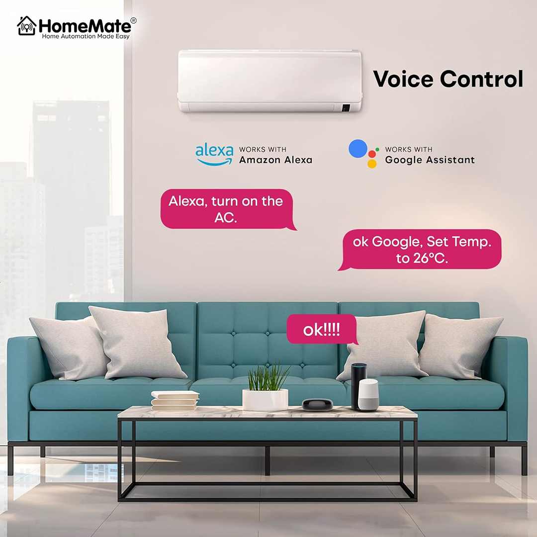 The HomeMate Smart IR Blaster (Model: HMIR1) is a compact smart remote controller that allows you to control IR-based devices like air conditioners, TVs, and set-top boxes using your smartphone or voice commands via Alexa, Google Assistant, or Siri. With support for over 80,000+ IR devices, DIY remote learning features, and smart home automation, this device transforms your home into a smart environment. Note: This device supports only IR, not RF, Bluetooth, or other protocols.