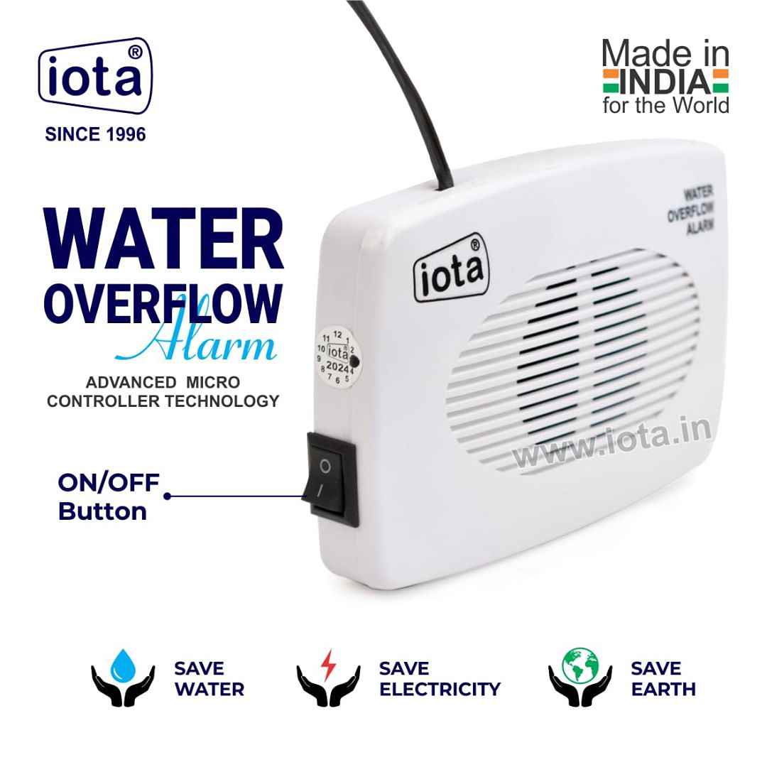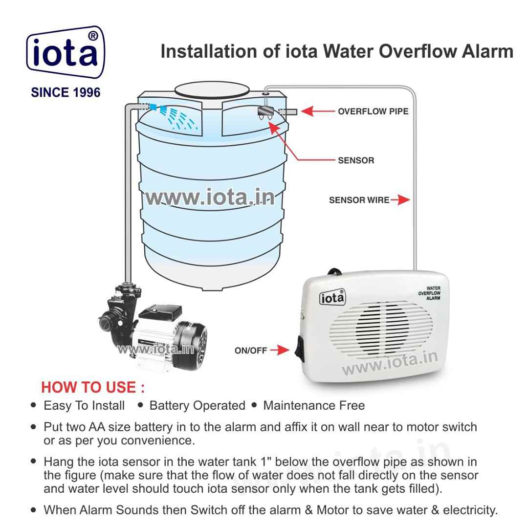 The iota Battery Operated Water Tank Overflow Alarm is a reliable solution to prevent tank overflow, offering a powerful buzzer alert and easy installation. Powered by 2 AA batteries, it comes with a 40-feet sensor wire, mounting kit, and a convenient on/off switch for controlled operation. Designed for efficiency and user-friendliness, this alarm also includes a 1-year warranty, making it ideal for homes and buildings needing a simple water monitoring system.