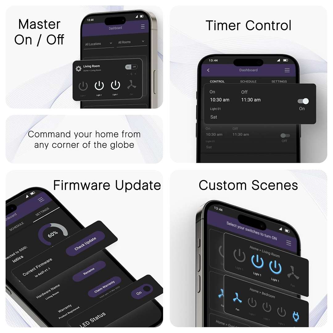 The Iotics Smart Touch Wi-Fi Switch is an elegant, wall-mountable home automation switch designed for convenience, safety, and style. Built with a capacitive touch interface and tempered glass panel, it supports remote control via mobile apps, voice assistants like Alexa and Google Home, and manual touch. Ideal for smart homes, it operates at 240V AC with a 6A current rating, offering IP65-rated durability and CE-certified safety.
