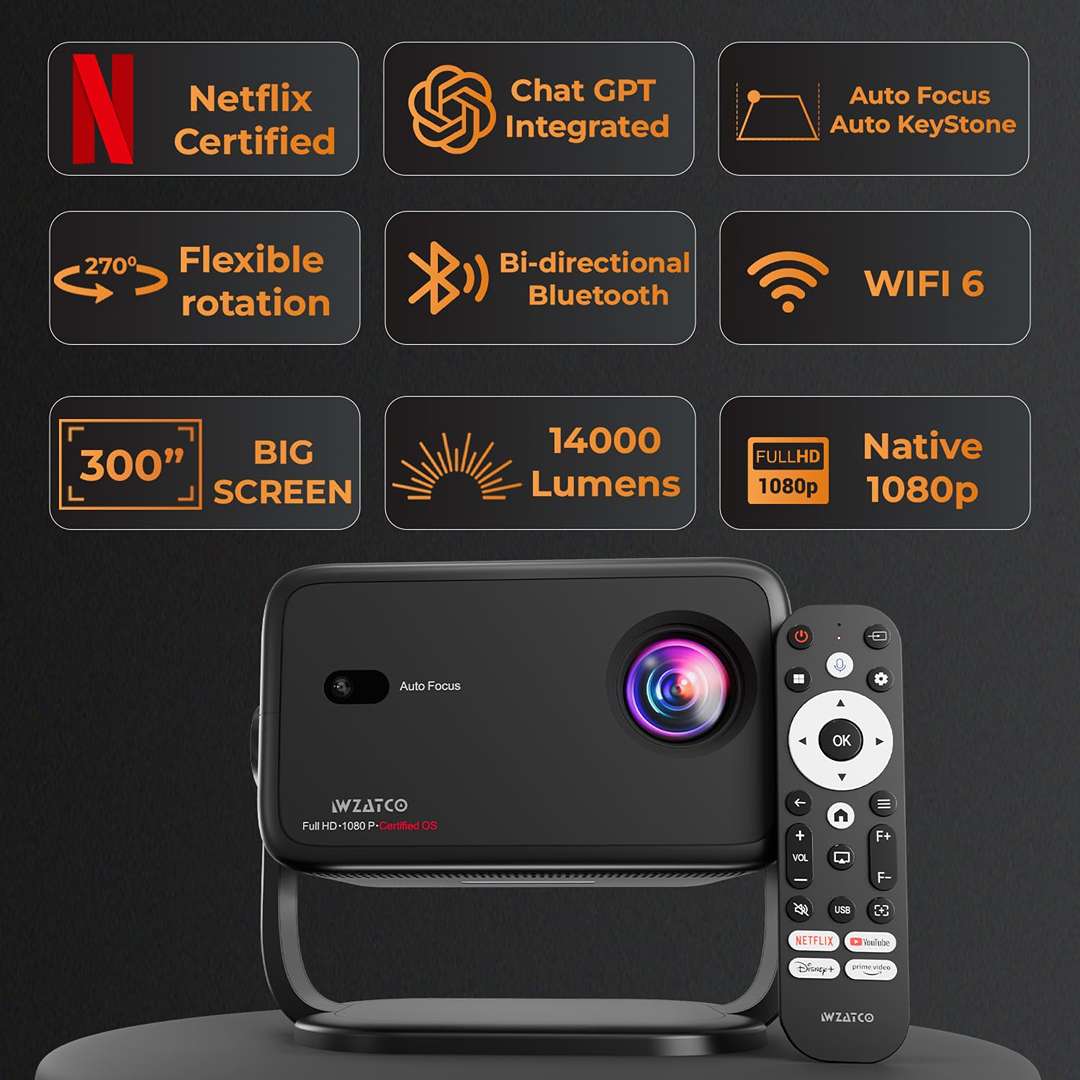 The WZATCO Yuva Vibe is a feature-packed LED projector designed for home cinema enthusiasts. With native 1080P resolution, 4K HDR support, and 14,000 lumens brightness, it delivers vivid visuals even in well-lit rooms. It features fully automatic adjustments (auto focus, keystone, obstacle avoidance), Netflix certification, and a certified operating system with built-in OTT apps. Enjoy seamless connectivity with Wi-Fi 6, Bluetooth, HDMI ARC, and smart control via voice assistant