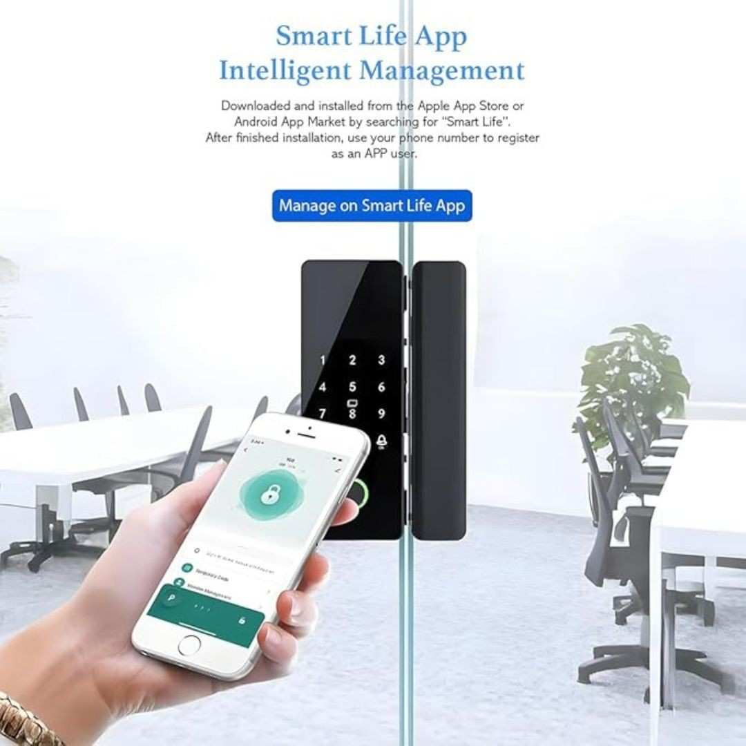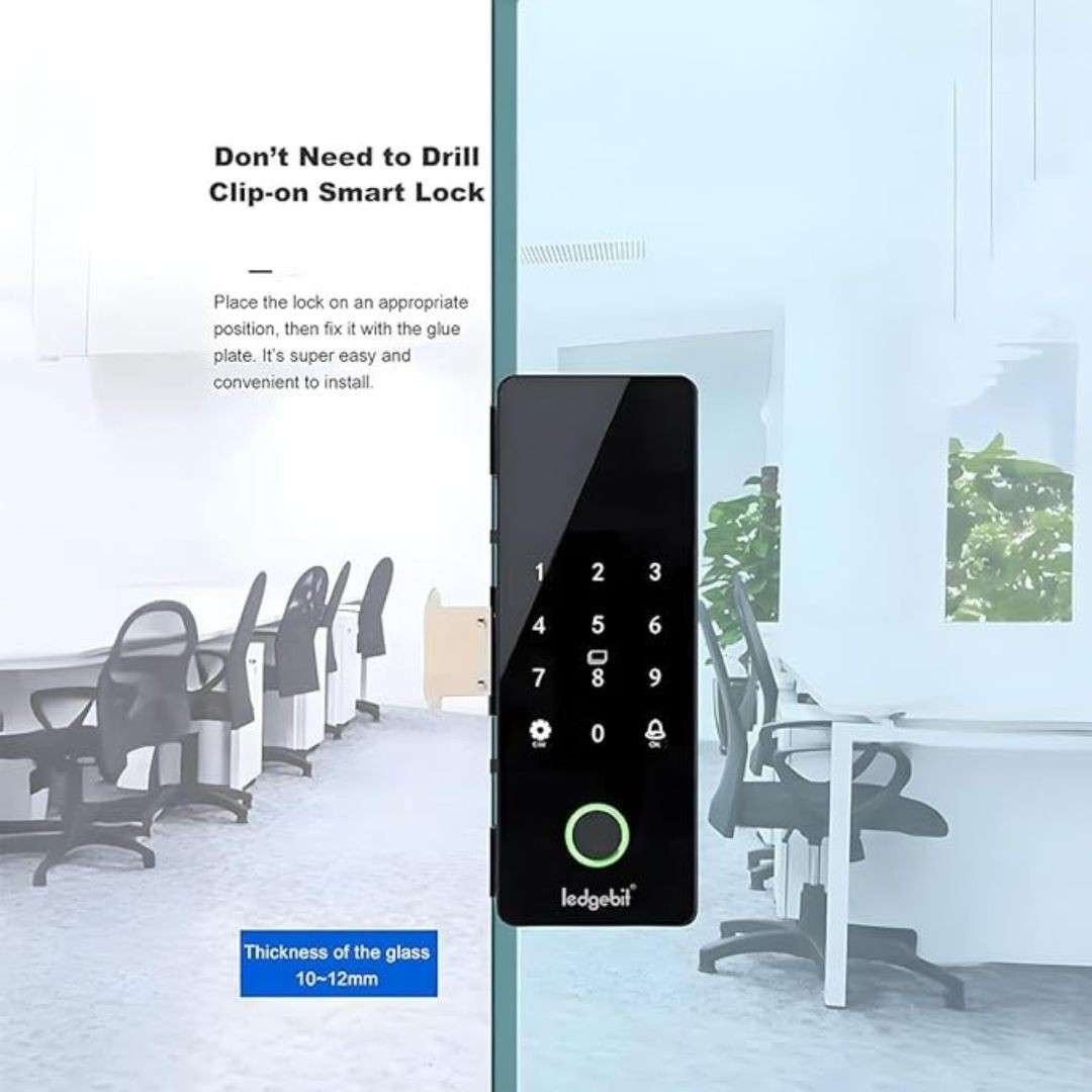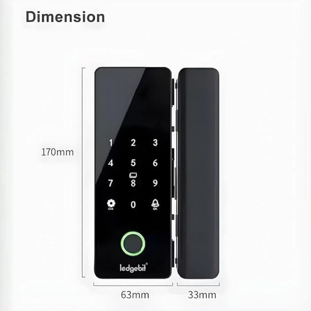 The Ledgebit Digital Glass Door Smart Lock (Model: LT-LBG2) is a sleek and secure locking solution designed specifically for glass doors. It features advanced access methods including biometric fingerprint scanning, a digital touch keypad, IC cards, mechanical keys, and app-based control via Bluetooth and Wi-Fi. With an auto-lock function and Smart Life App integration, it combines convenience with high-end security in a compact and stylish design. (NO INSTALLATION)