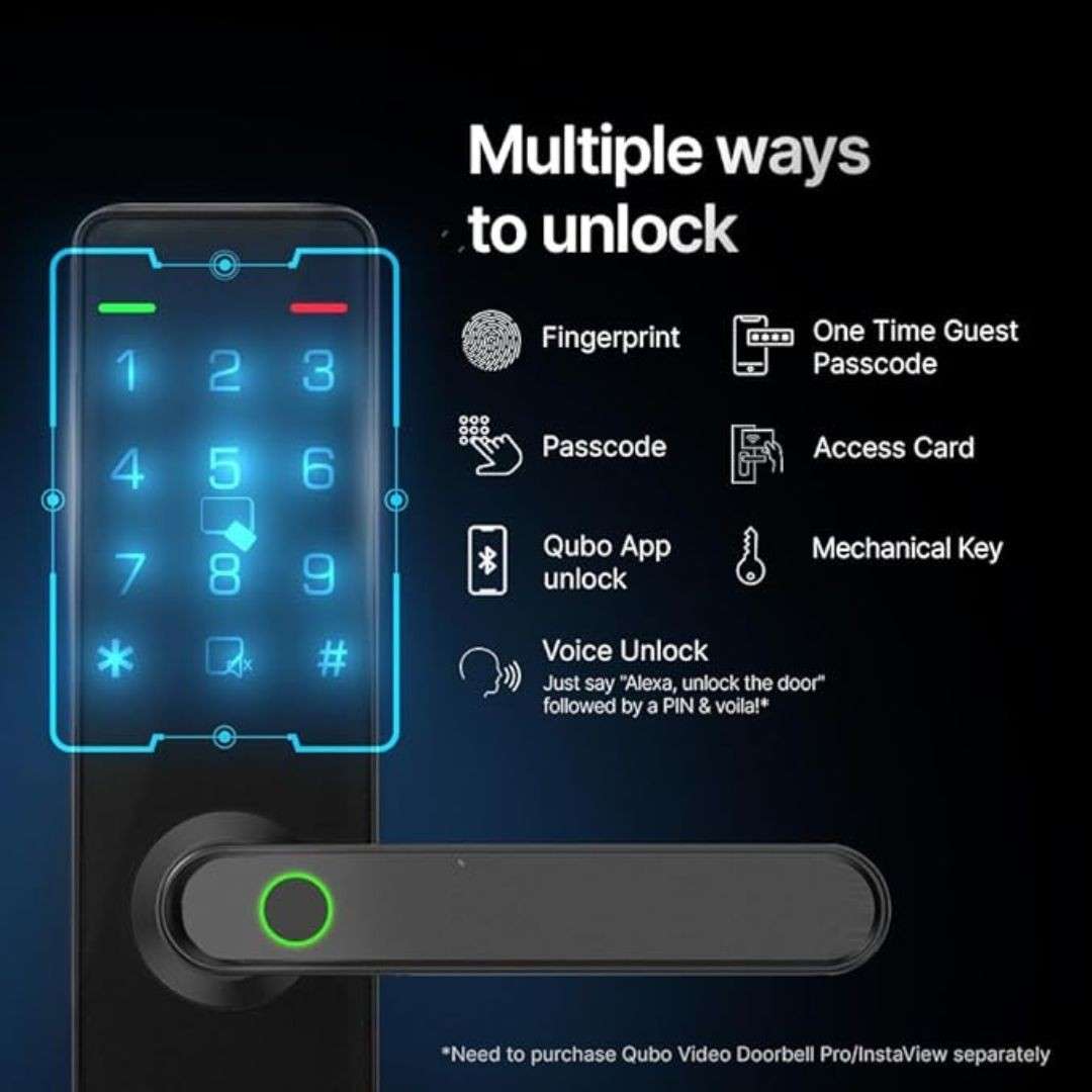 The Qubo Essential Black Smart Door Lock is a sleek, matte-finished biometric lock crafted from durable stainless steel. It offers multiple unlocking methods including fingerprint, passcode, OTP, key, and fob, along with Bluetooth connectivity and touch control. Designed for safety and convenience, it includes child lock, low battery alerts, and comes with an easy installation kit. (NO INSTALLATION)