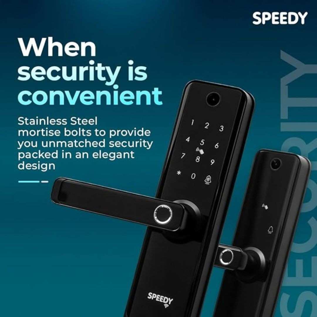 The SPEEDY OZ-ATOM-i-22-L Smart Lock is a modern, secure door lock equipped with biometric, combination, and mortise locking mechanisms. With advanced features like an in-built camera, Wi-Fi connectivity, app control (Ozolife), and alarm & passcode unlock, it ensures safety with smart convenience. Its sleek, polished black finish and robust ABS & aluminium body make it ideal for residential and commercial use. (NO INSTALLATION)