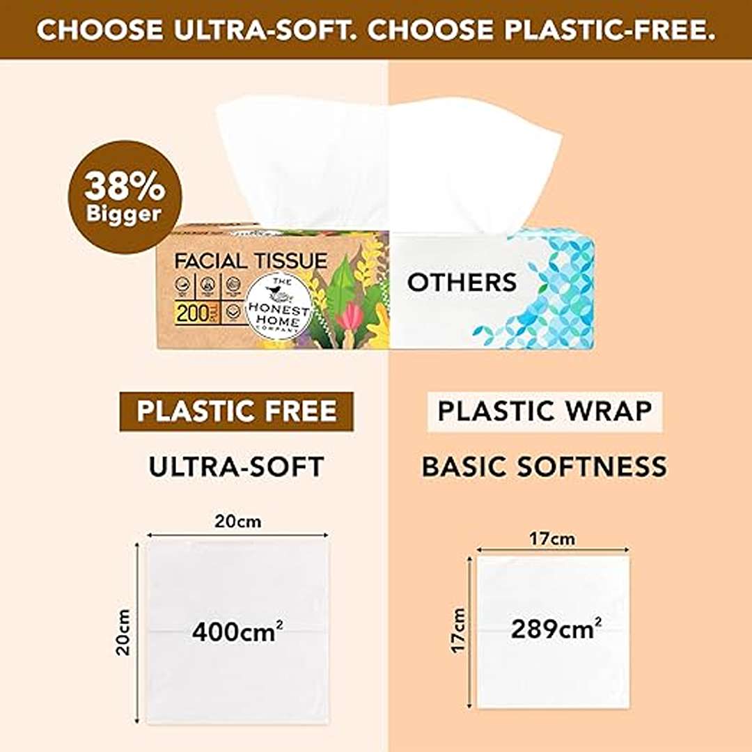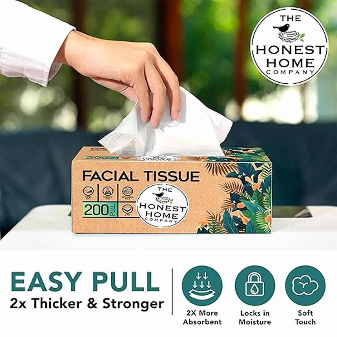 THE HONEST HOME COMPANY 2-Ply Facial Tissue Pack (3 Boxes, 600 Sheets) offers ultra-soft, strong, and highly absorbent tissues made from 100% virgin wood pulp. Ideal for daily use, makeup removal, and sensitive skin.