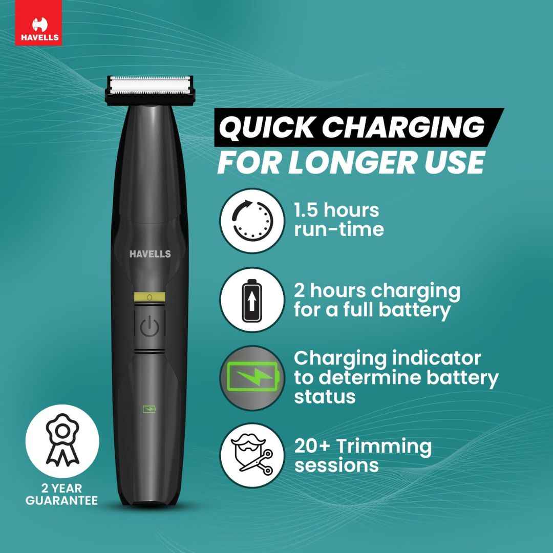 The Havells ST8000 Shimmer Plus is a premium dual-blade shaver cum trimmer designed for both wet and dry use, offering a smooth, nick-free shave. Its cordless and rechargeable design provides up to 90 minutes of runtime after a 2-hour fast charge. Featuring an IPX7 fully waterproof body, this device is perfect for versatile grooming needs with 4 different comb attachments for customized styling. Built with stainless steel foil blades, it guarantees precision and durability, backed by a 2-year warranty.