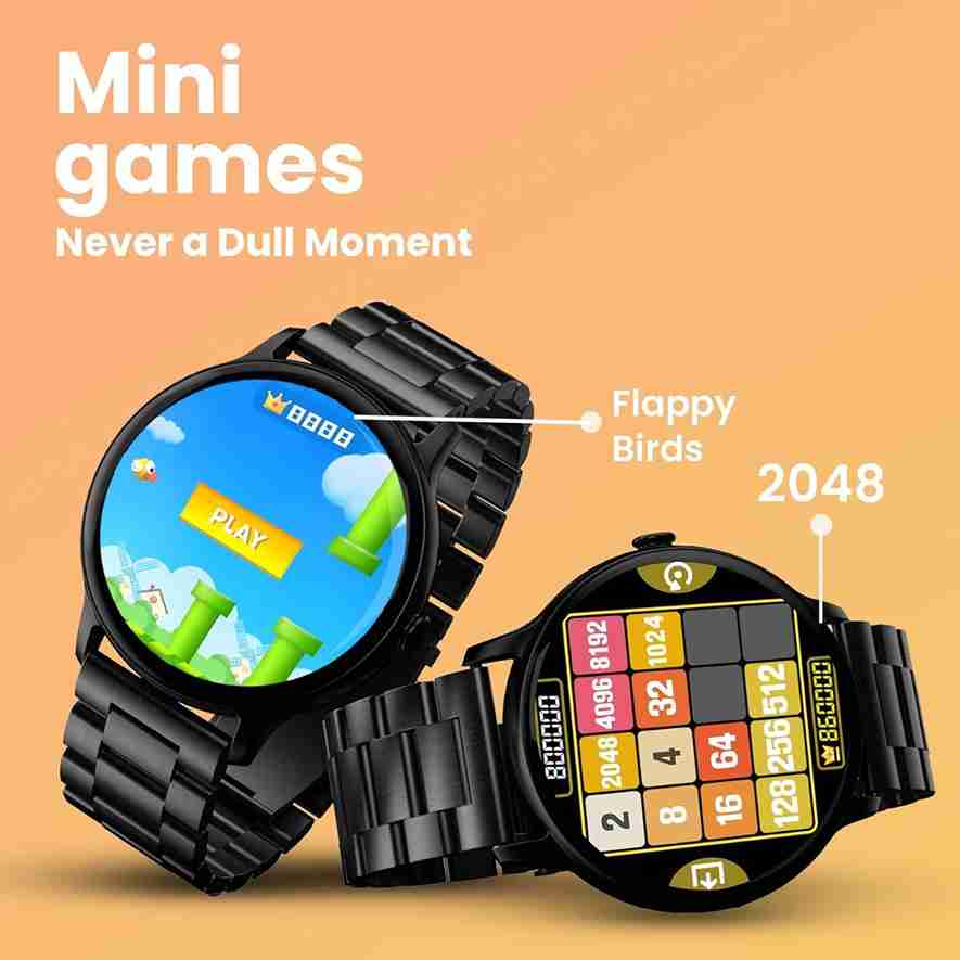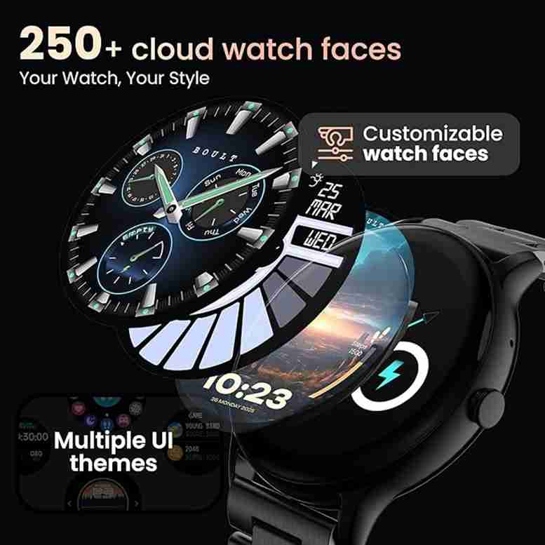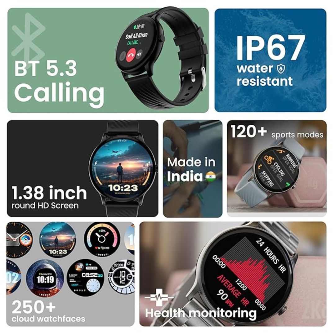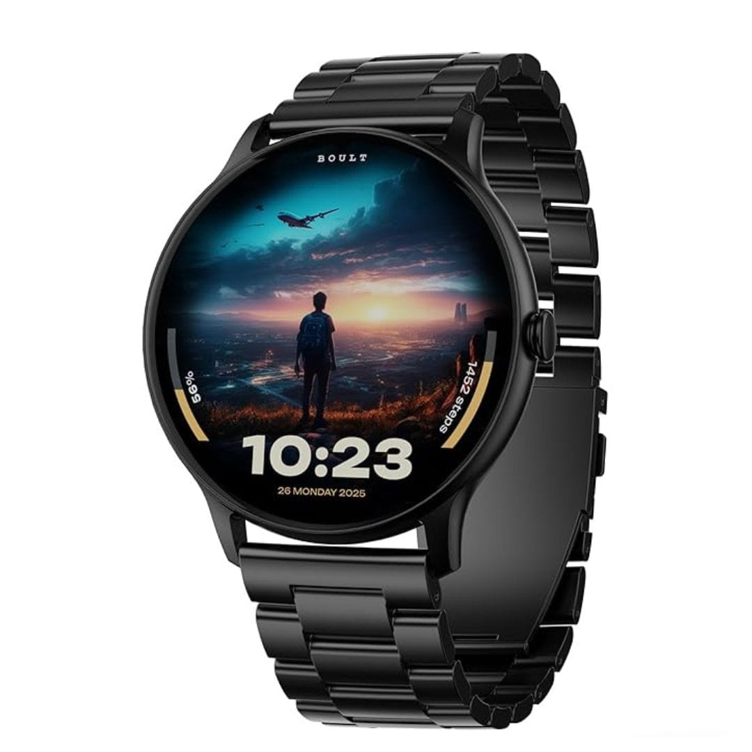 The Boult Dire Smartwatch – Jet Black combines bold design with essential smart features. It features a 1.38" HD curved screen, Bluetooth 5.2 calling, and 500 nits brightness for clear, colorful visuals. With 120+ sports modes, SpO2 monitoring, IP67 water resistance, and a robust zinc alloy frame, this smartwatch offers a durable, health-focused experience without compromising on style.