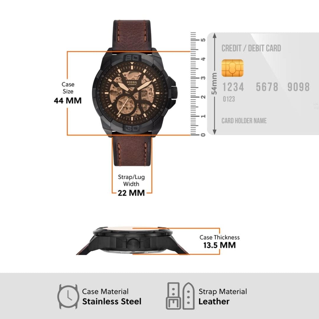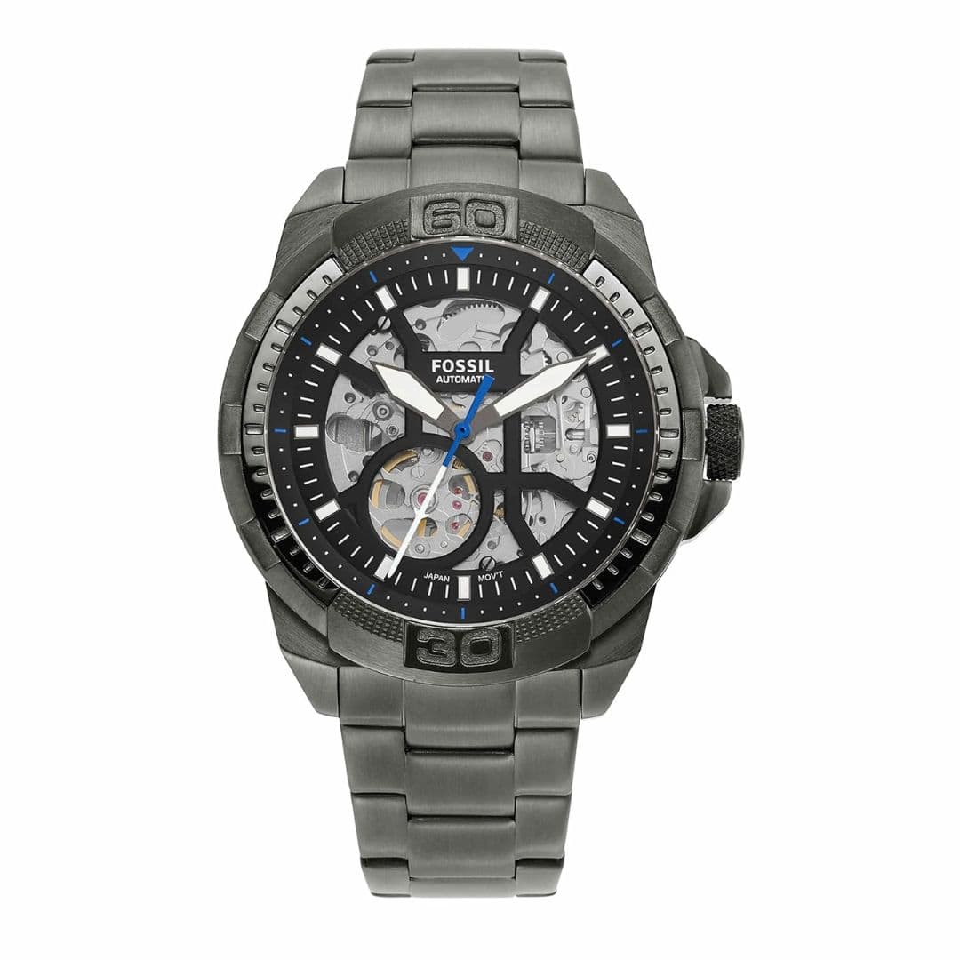 The Fossil Bronson ME3217/ME3219/ ME3218 is a stylish men's automatic watch featuring a 44mm smoke-plated stainless steel case, a 22mm gray stainless steel band, and a sleek black dial without a date window. It comes with a mineral crystal face, is water-resistant up to 50 meters, and includes a 2-year international warranty. Designed for both casual and semi-formal wear, it offers chronograph functionality and interchangeable straps.