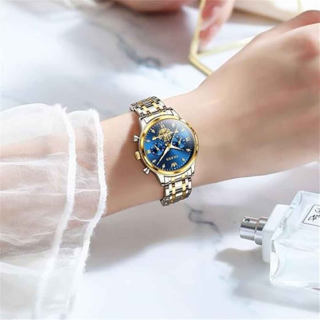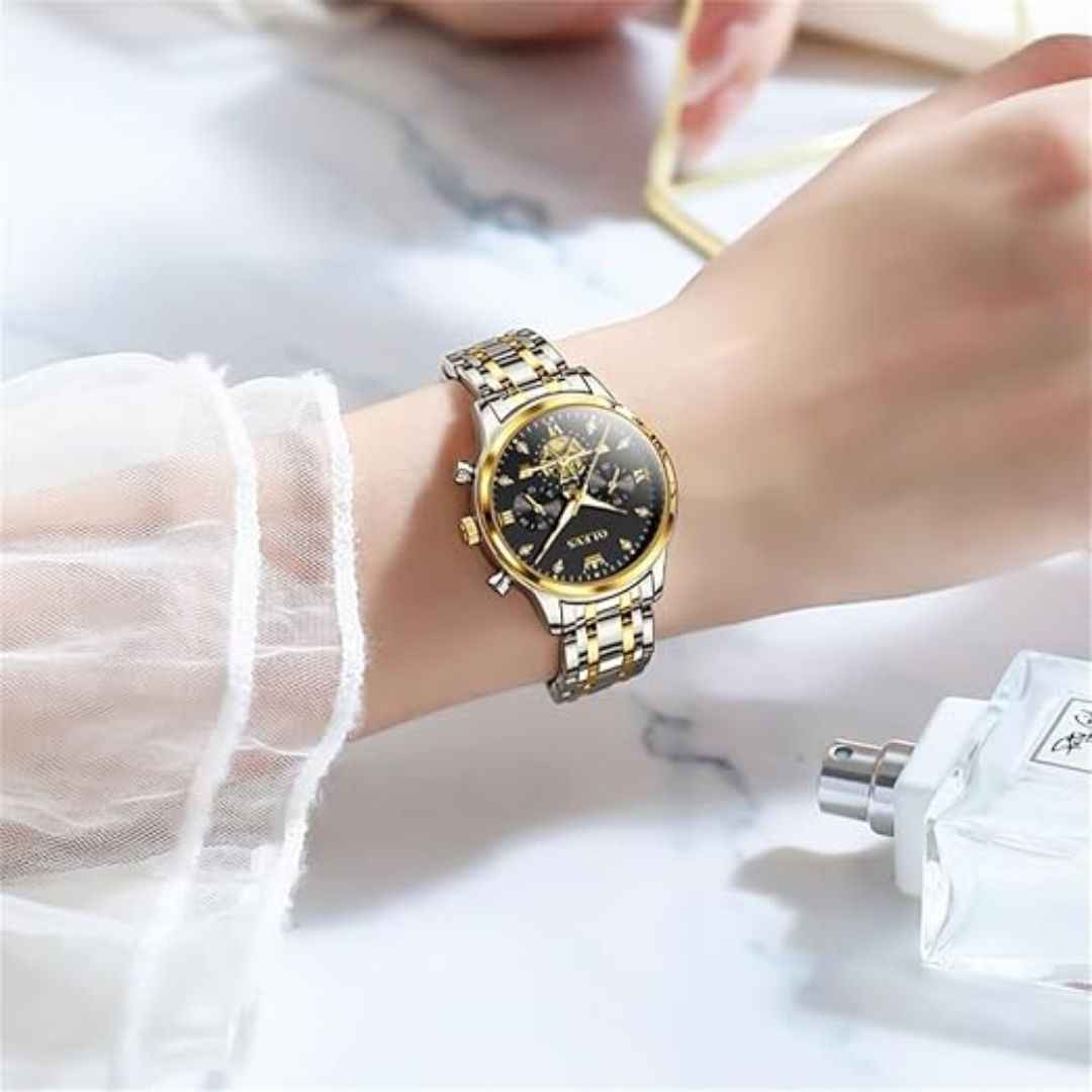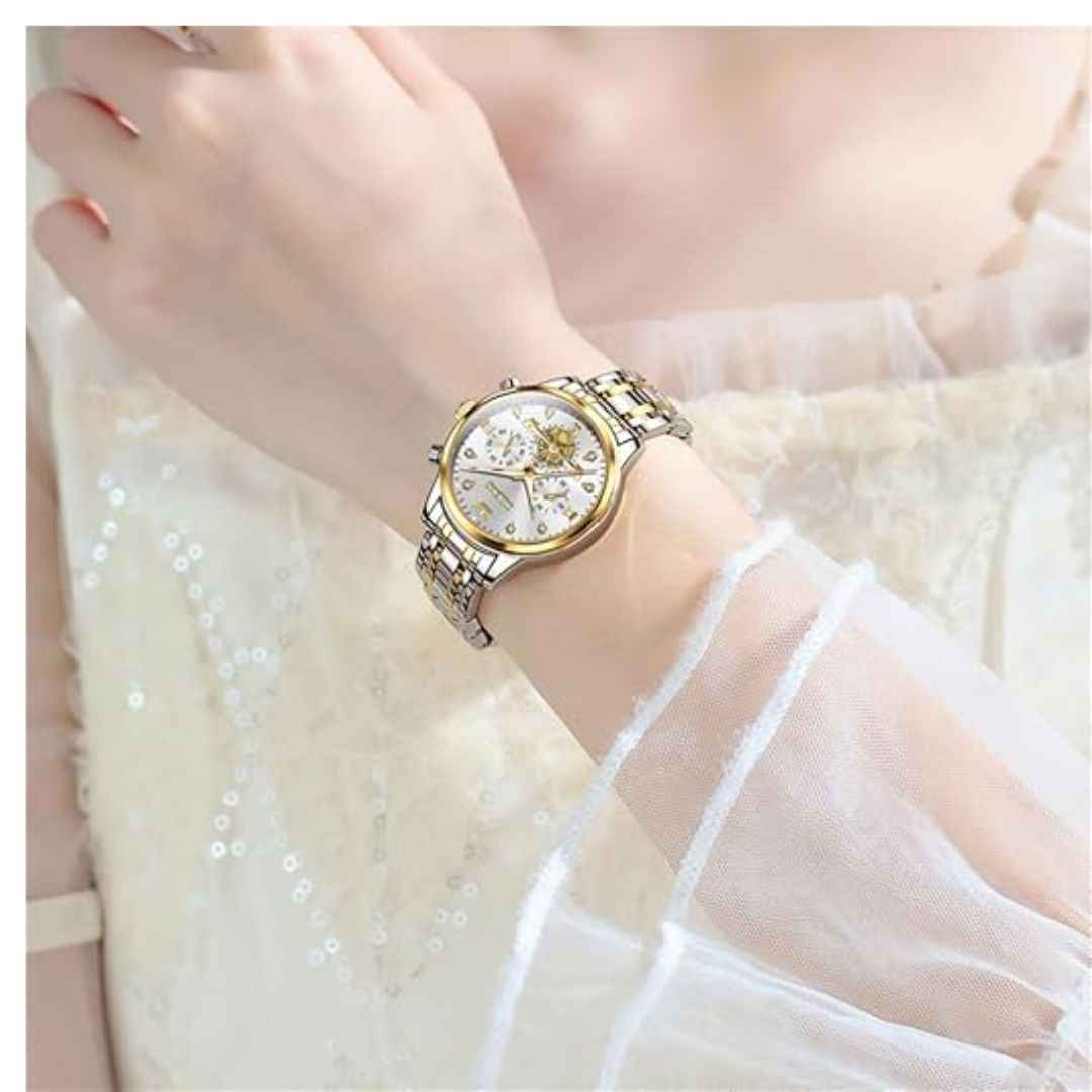 Add timeless charm to your wrist with the OLEVS Two-Tone Women's Quartz Watch. Featuring a stunning diamond-accented dial with a decorative stopwatch sub-dial, this elegant timepiece combines fashion and function. Made from durable stainless steel in a classic two-tone finish and powered by reliable quartz movement, it also offers 3ATM water resistance—making it the perfect gift for any special occasion.