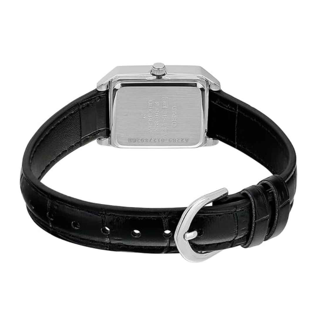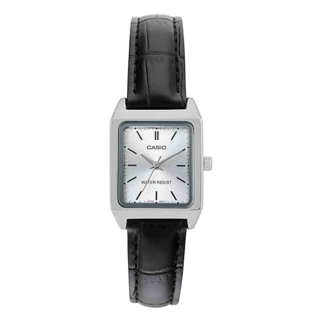 Elegant and minimalist, the Casio LTP-V007L-7E1UDF women’s analog watch features a sleek rectangular silver dial paired with a classic black leather strap. Designed for everyday sophistication, this lightweight watch offers water resistance and quartz precision movement, making it both functional and stylish.