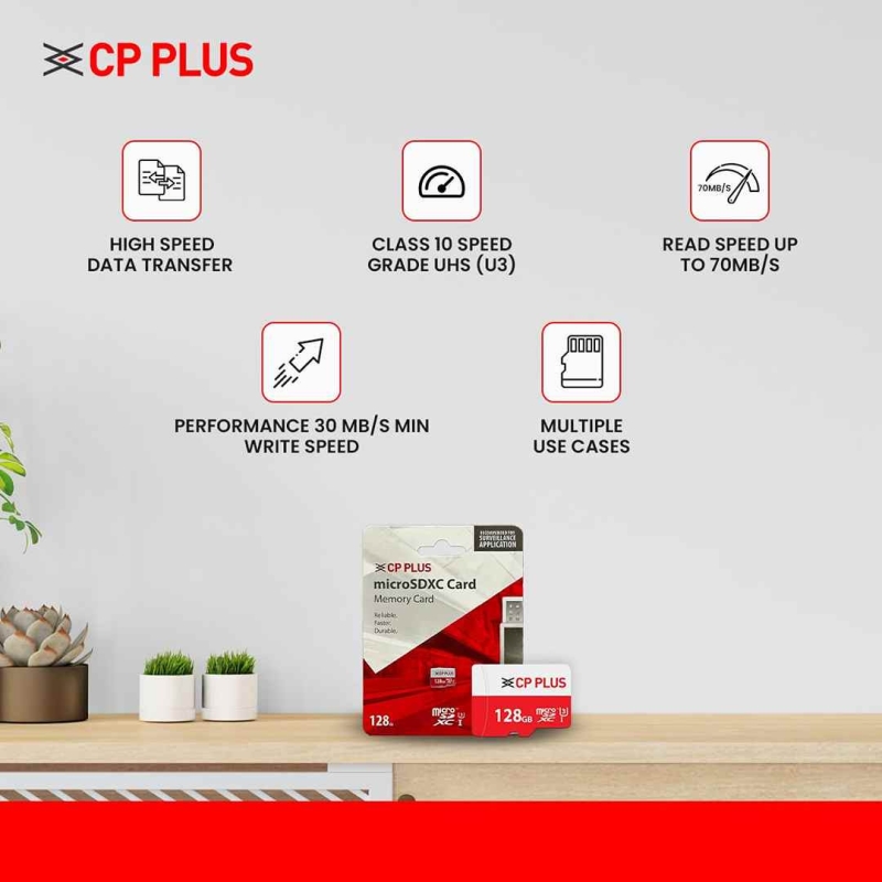 The CP PLUS CP-UM128C 128GB microSDXC Memory Card delivers dependable, high-speed performance for smartphones, dashcams, DSLRs, Wi-Fi/security cameras, PCs, and drone cameras. With UHS-I U3, Class 10, and Video Speed Class 30, it supports smooth 2K and 4K video recording and continuous photography. Featuring a 30MB/s minimum write speed, long-lasting durability of up to 1000 read/write cycles, and a 5-year limited warranty, this rugged card is built for reliable everyday and professional use.