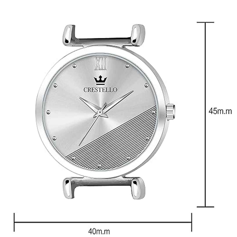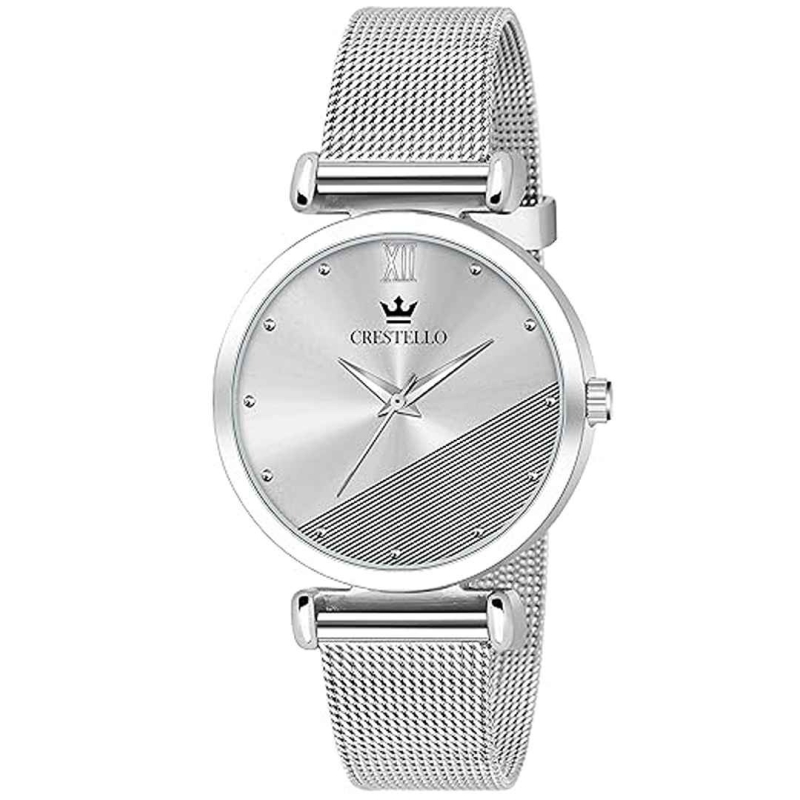 The CRESTELLO is an elegant ladies analog wristwatch featuring a pink dial housed in a silver brass case. Paired with a sleek stainless steel mesh strap and a secure buckle clasp, this stylish timepiece offers precision with its quartz movement. Lightweight and classy, it comes with a 1-year manufacturer’s warranty, making it ideal for daily wear or gifting.