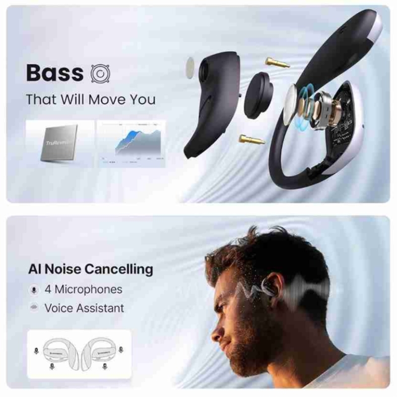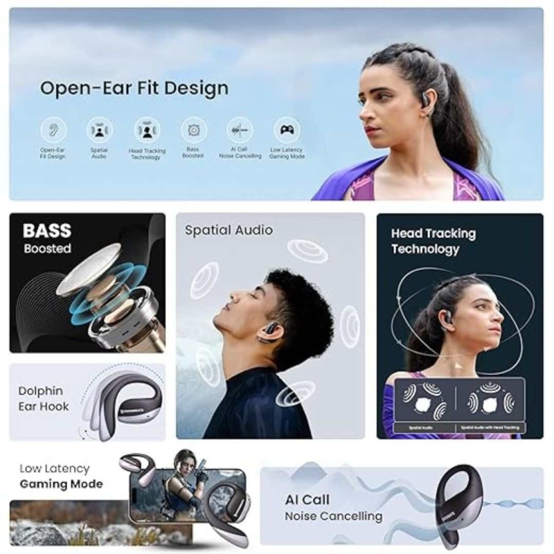 CrossBeats Arc Buds OWS are India’s first open-ear wireless earbuds with 360° spatial audio and head-tracking technology, delivering a cinema-like immersive sound experience. Equipped with 14.2mm Titanium drivers, AI noise cancellation, and quad microphones, these lightweight over-ear headphones offer unmatched comfort, secure fit, and ultra-low latency for gaming and calls. With up to 100 hours of total playback and Bluetooth 5.4, they ensure superior battery life and seamless multi-device connectivity. Designed for modern lifestyles—music, fitness, gaming, and more.
