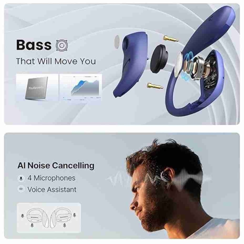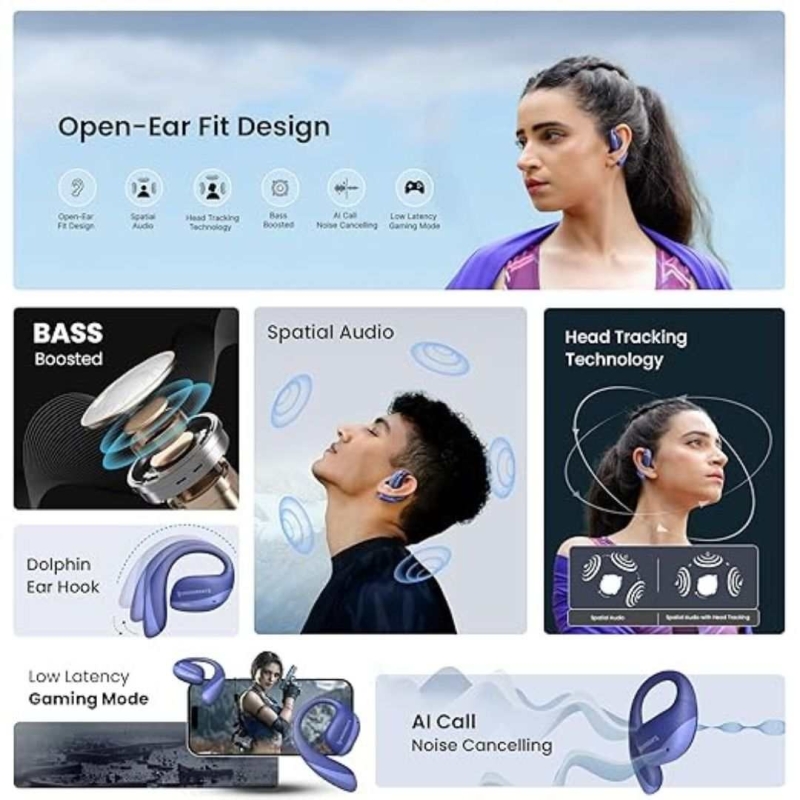 CrossBeats Arc Buds OWS (Blue) are cutting-edge open-ear wireless earbuds featuring 360° spatial audio with head tracking using TruReverb™ technology. These earbuds are designed for immersive sound, perfect comfort, and extreme performance with up to 100 hours of total playback and Bluetooth 5.4 for seamless multi-device connectivity. With AI-powered quad mic noise cancellation, IPX5 water resistance, and fast Type-C charging, these earbuds are ideal for music lovers, gamers, and fitness enthusiasts.