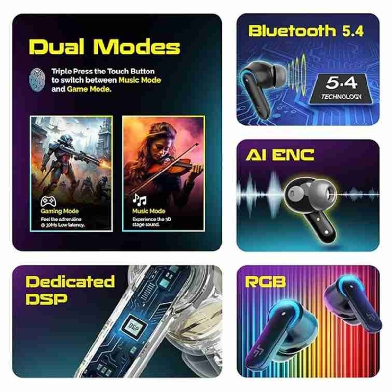 | Special Features | RGB Lights, 3D Soundstage, Dual EQ Modes, Touch Control, Fast Charging |