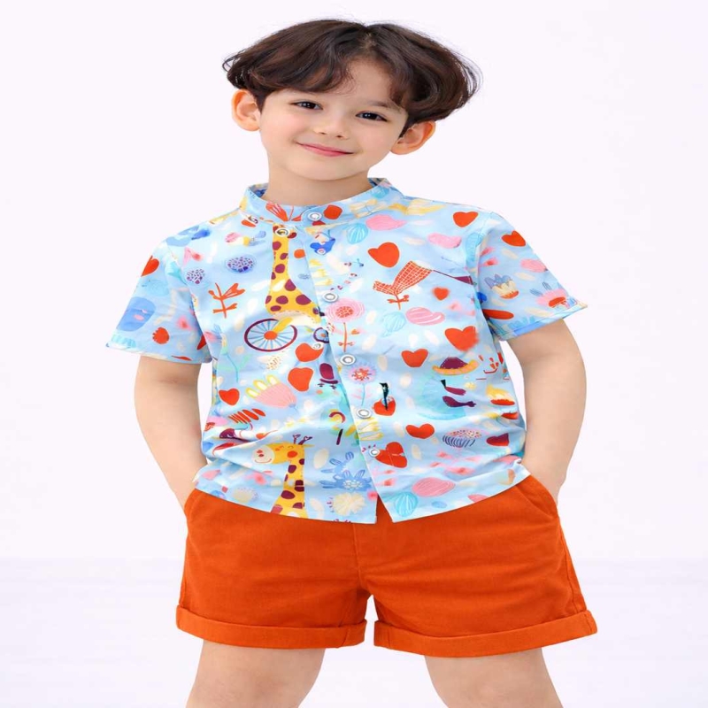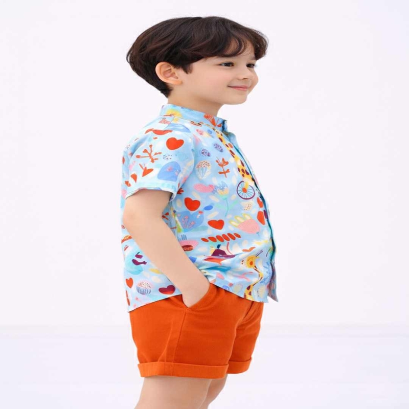 Give your little one a bright and playful summer look with this stylish Boys Printed Shirt & Shorts Set. The set features a sky blue half sleeve shirt with colorful cartoon, heart & fun prints paired with solid black shorts, making it perfect for a cheerful kids outfit. Made from soft, lightweight and breathable cotton blend fabric, this set provides all-day comfort. Ideal for summer wear, daily use, playtime, outings, vacations and casual parties.