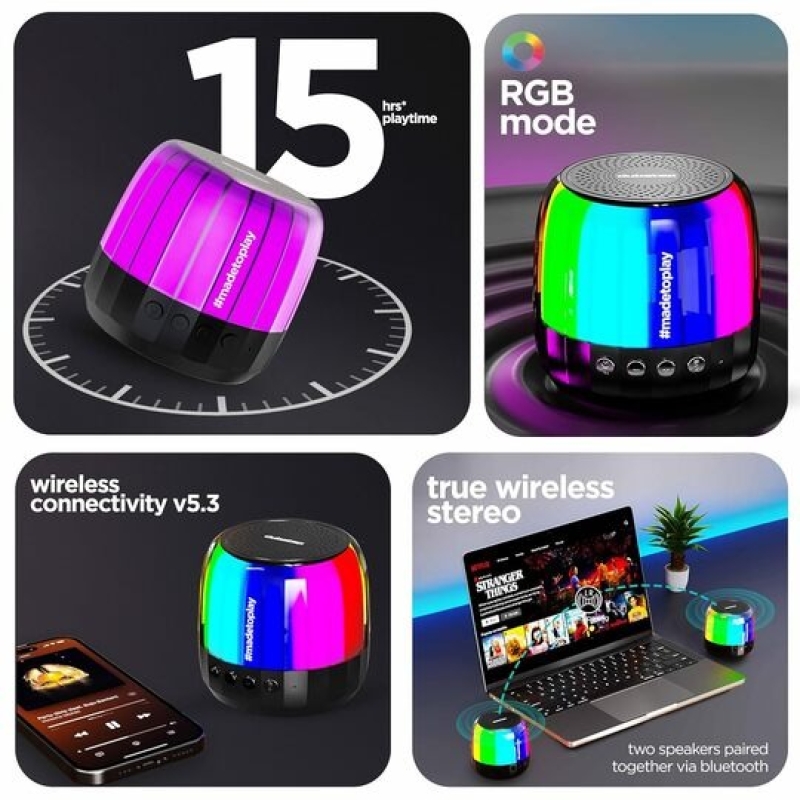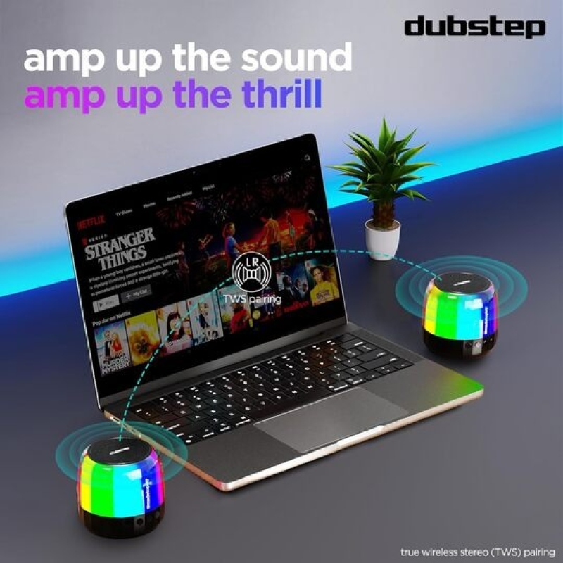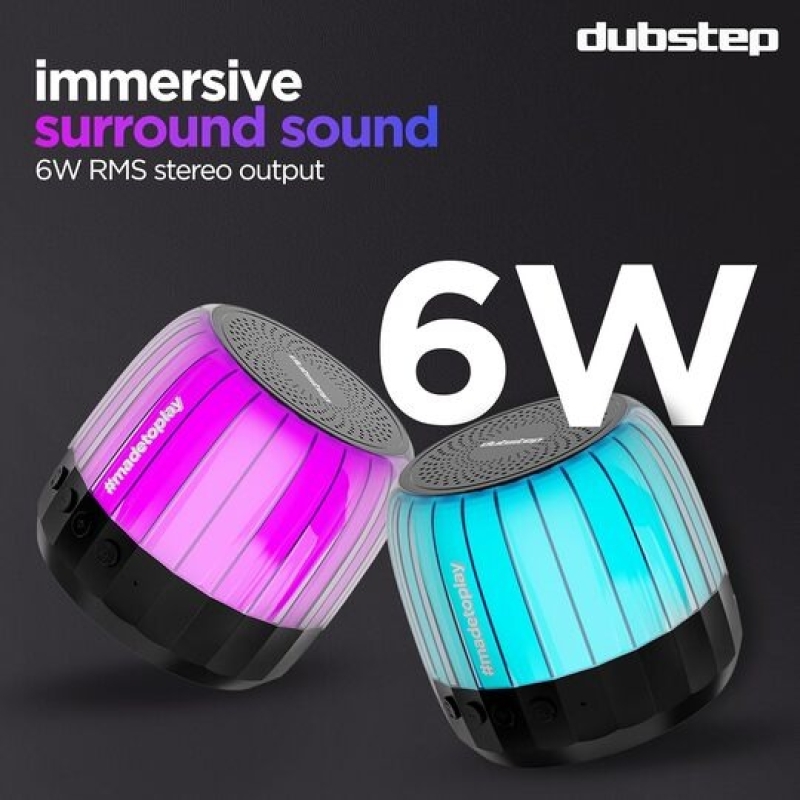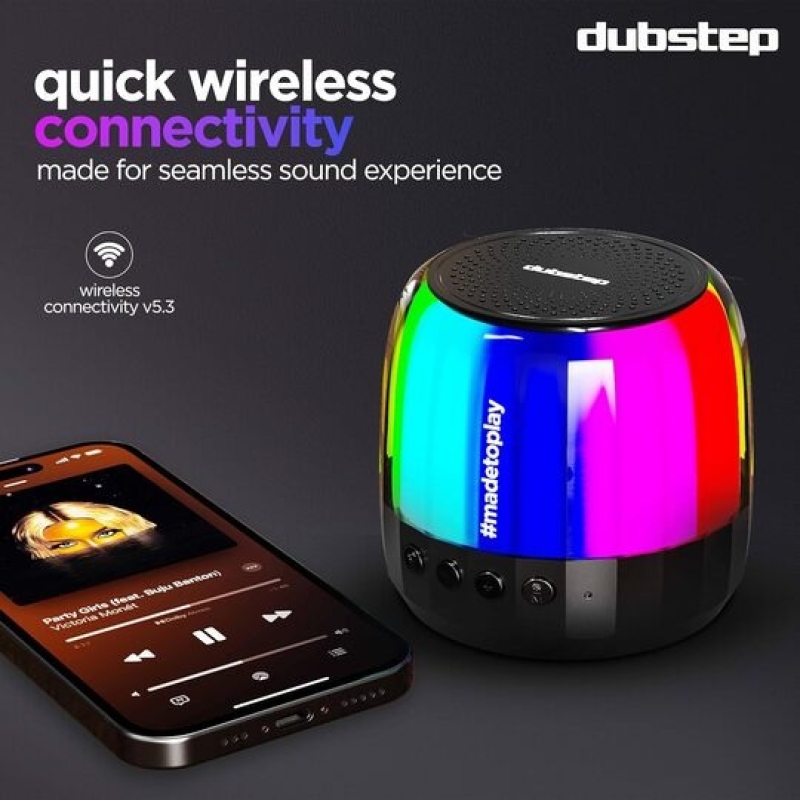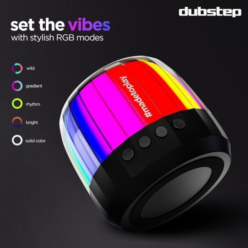 The Dubstep Pop 650 is a compact 6W Bluetooth speaker designed for portable entertainment. It features Bluetooth v5.3 for stable wireless connectivity, multiple RGB lighting modes, True Wireless Stereo support, and an impressive 15-hour battery life. With smart controls, FM radio, built-in microphone, and a durable ABS body, it is ideal for music playback at home or on the go.