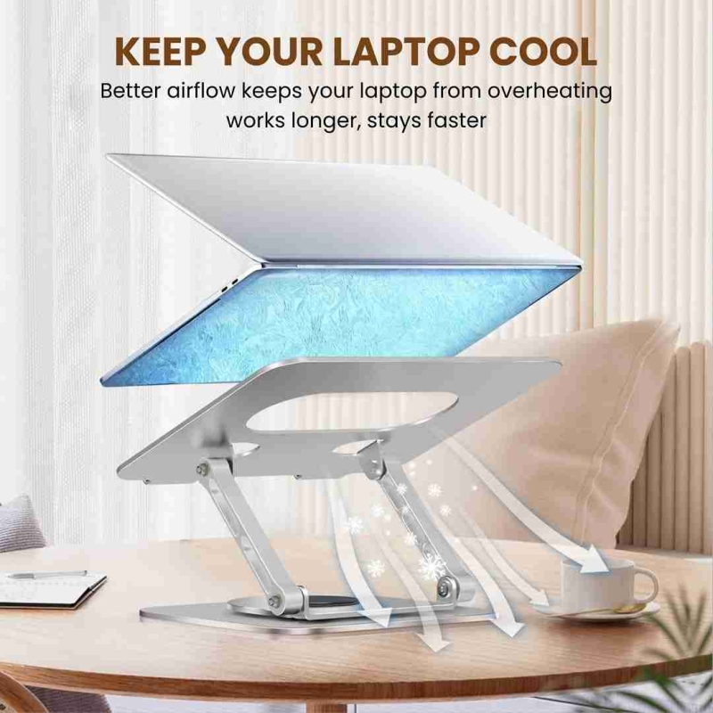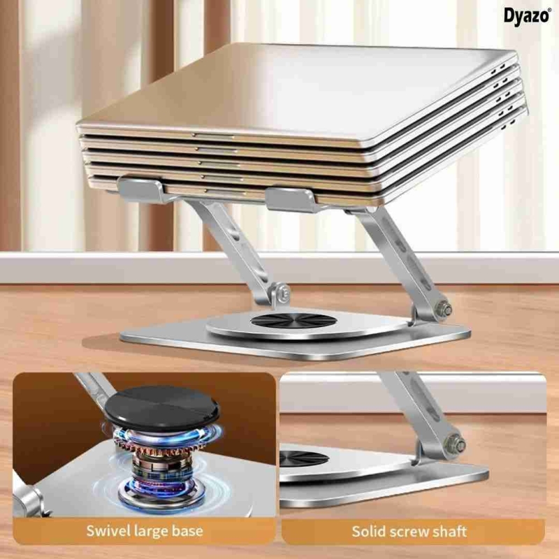 The Dyazo Multi-Angle Laptop Stand is a height- and angle-adjustable stand with a 360° rotating base, designed for laptops up to 15.6 inches (2 kg max). Made with a durable design and perforated platform for heat dissipation, it promotes ergonomic posture, improves airflow, and is ideal for work, meetings, or group projects.