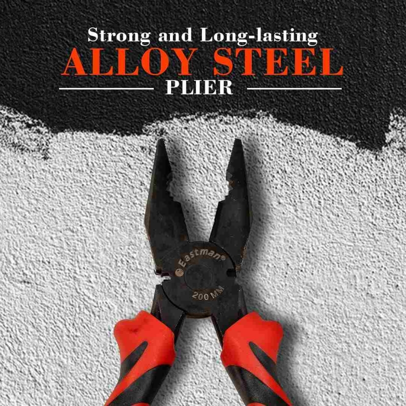 The Eastman 8-inch Combination Plier is a professional-grade hand tool made from durable chrome vanadium alloy steel. Designed for gripping, holding, and cutting wires, it features laser-hardened cutting edges, strong gripping teeth, and an ergonomic, non-slip cellulose acetate sleeve for comfortable long-term use. Ideal for electricians, artisans, and electronics repair work.