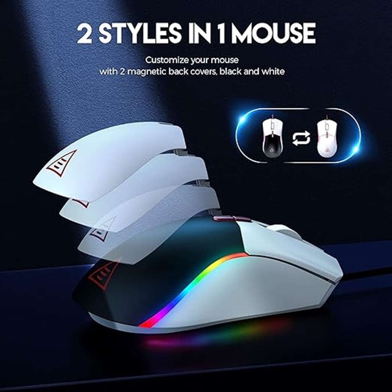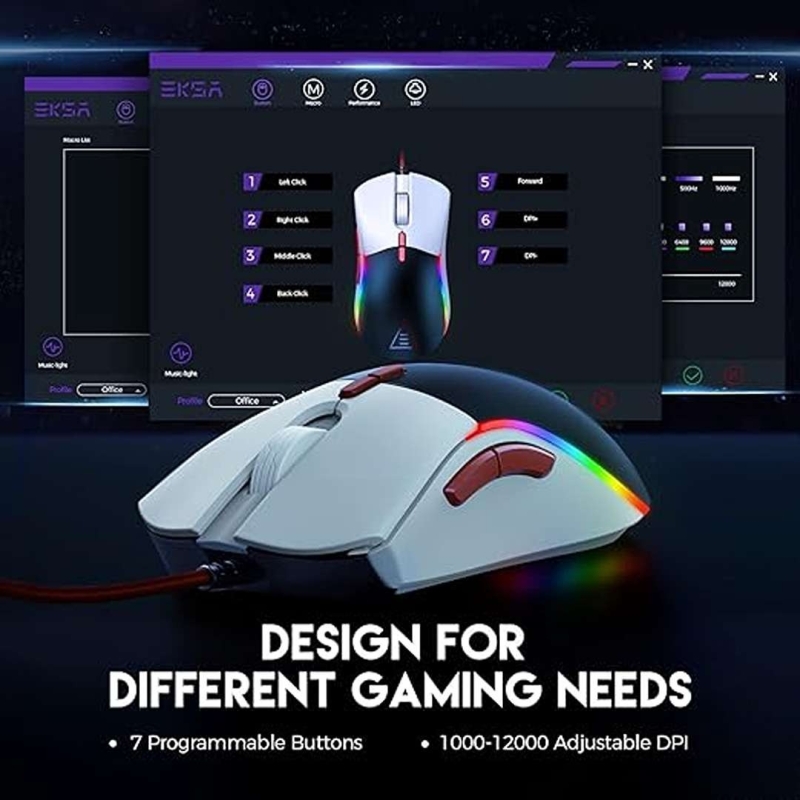 The EKSA EM200 Wired Gaming Mouse offers customizable style and precision with dual magnetic back covers, 13 RGB lighting modes, and a high-accuracy 12,000 DPI optical sensor. Its tunable weight system, 7 programmable buttons, and ergonomic ambidextrous design ensure comfort, control, and adaptability for intense gaming sessions.