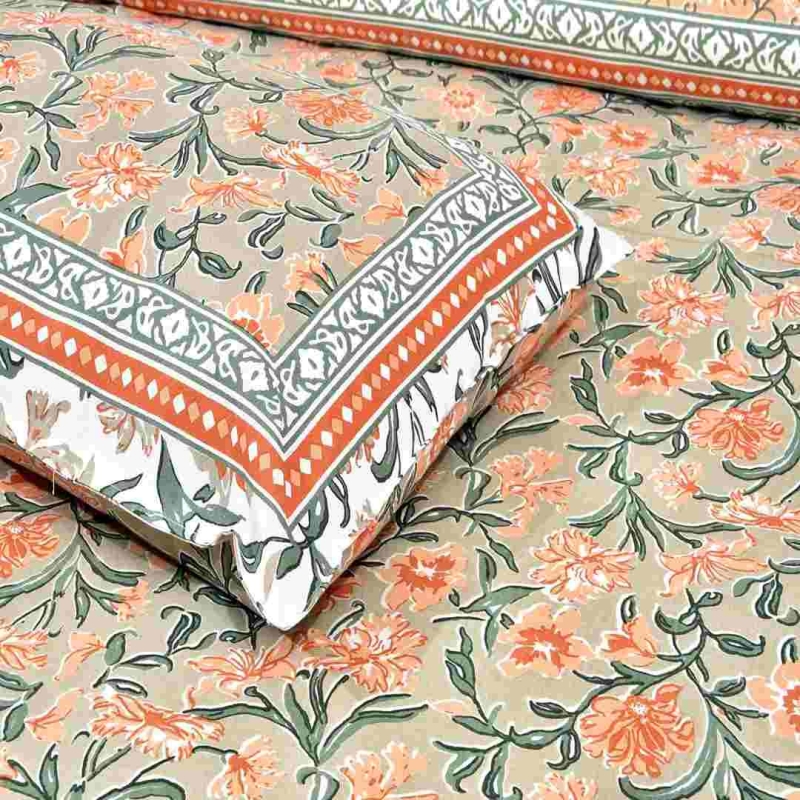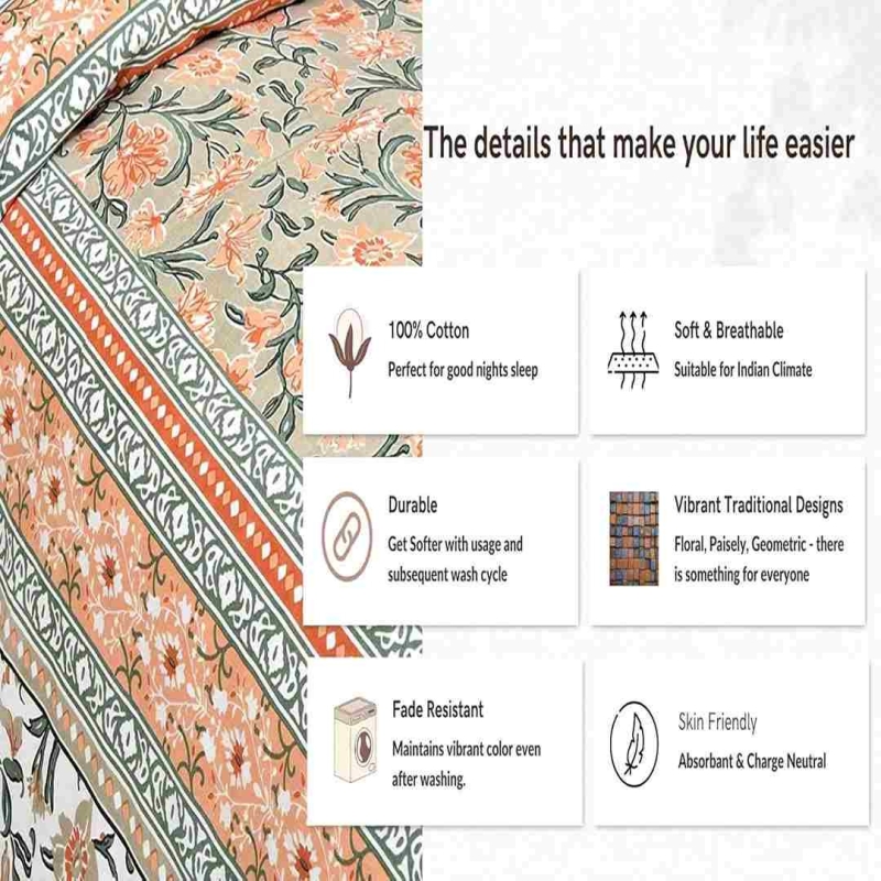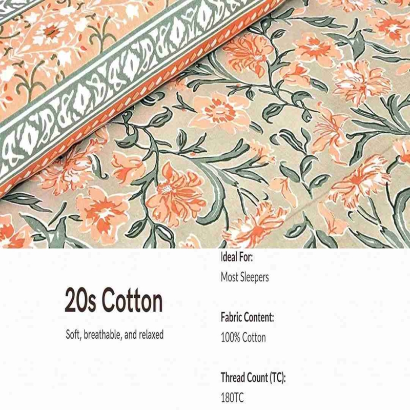 The elanorhomes Block Print Single Bedsheet is crafted from 100% pure cotton, offering a soft, breathable, and skin-friendly feel for everyday comfort. Featuring a vibrant Tropical Garden floral pattern inspired by traditional Rajasthani prints, this modern single-bed set includes a bedsheet and one pillow cover. With a high 240 thread count, anti-pilling properties, and easy machine-wash maintenance, it is perfect for bedrooms, guest rooms, or gifting on special occasions.