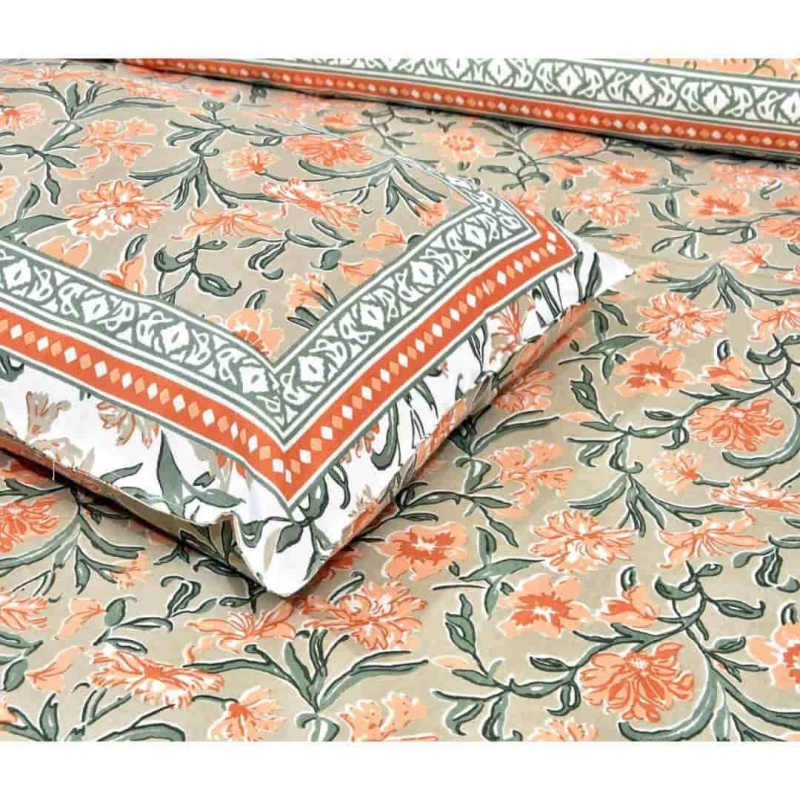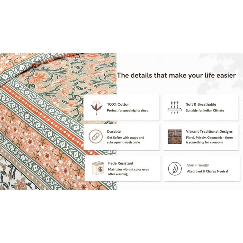 The elanorhomes Block Print Single Bedsheet is crafted from 100% pure cotton, offering a soft, breathable, and skin-friendly feel for everyday comfort. Featuring a vibrant Tropical Garden floral pattern inspired by traditional Rajasthani prints, this modern single-bed set includes a bedsheet and one pillow cover. With a high 240 thread count, anti-pilling properties, and easy machine-wash maintenance, it is perfect for bedrooms, guest rooms, or gifting on special occasions.