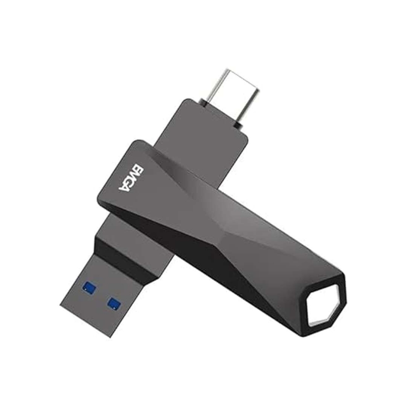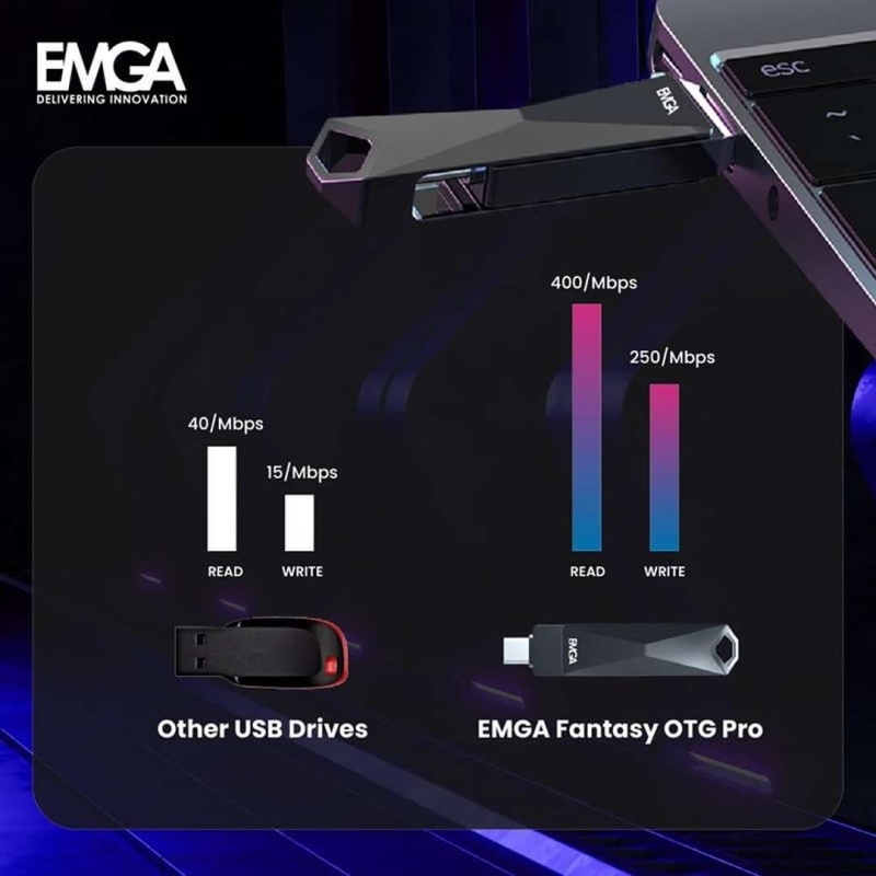 The EMGA Delivering Innovation 128GB Ultra Fast Pro Flash Drive is a 2-in-1 USB storage solution featuring both USB Type-C and Type-A connectors for seamless data transfer across smartphones, tablets, Macs, and PCs. With impressive read speeds up to 400MB/s and write speeds up to 200MB/s, it offers fast file movement, durable dustproof and shockproof construction, and a lightweight design for everyday portability.