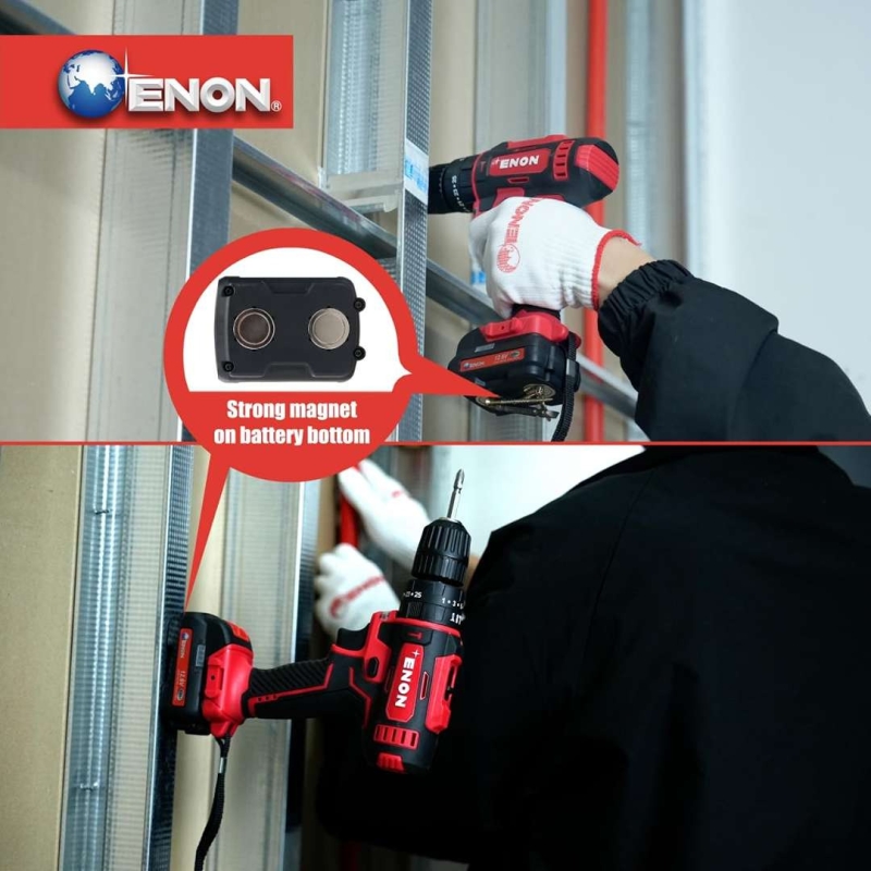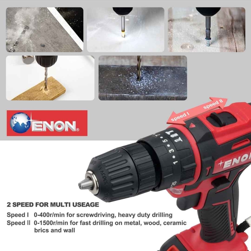 The ENON Cordless Impact Drill (XE-CD1610) is a compact yet powerful all-in-one tool designed for DIY users and professionals alike. With multiple working modes, 25 torque settings, dual 1.5Ah lithium batteries, and an 82-piece accessory kit, it delivers reliable performance for drilling, screw-driving, and impact tasks across wood, metal, plastic, concrete, and tiles. Its ergonomic design, built-in LED light, and portable carry case make it ideal for home improvement and job-site use.