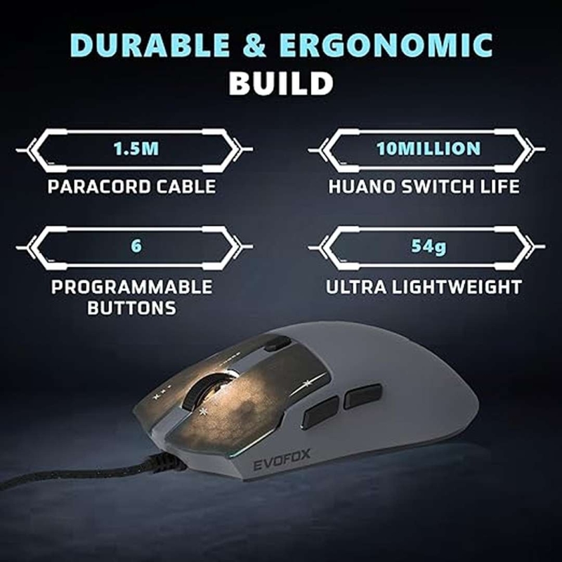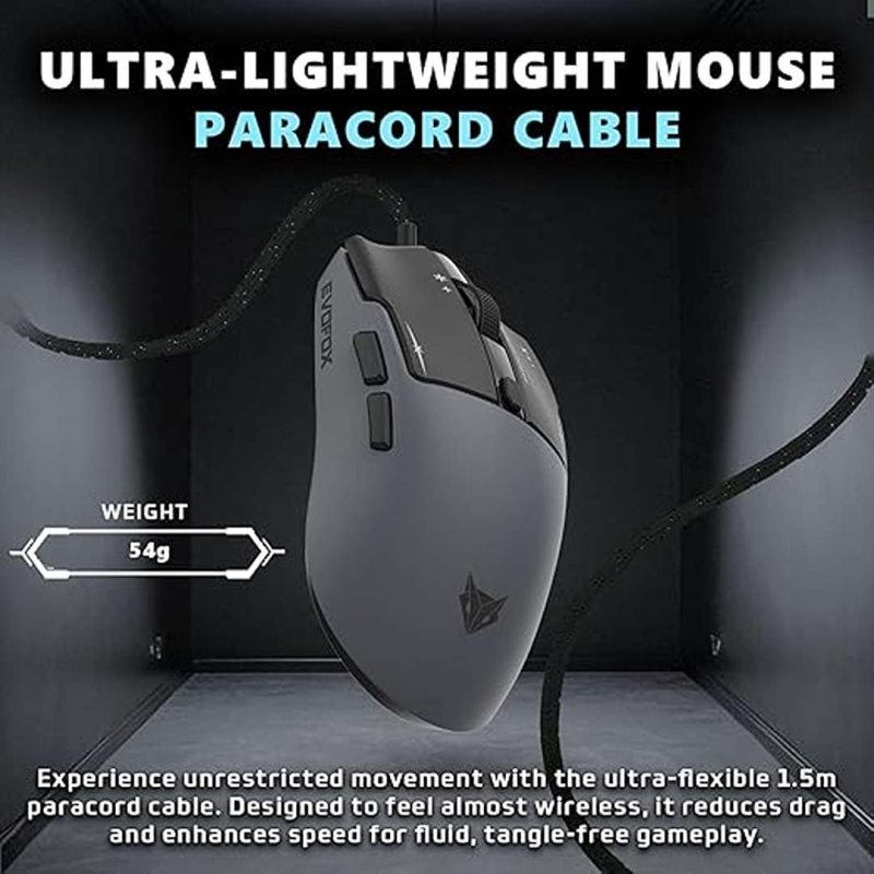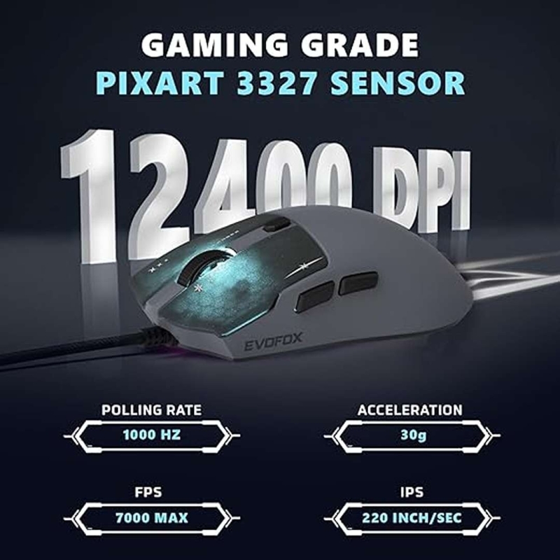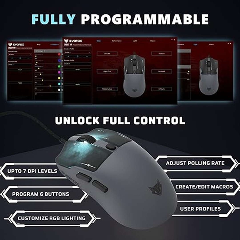 The EvoFox Ghost Air Gaming Mouse (Grey) is an ultra-lightweight, high-precision wired mouse designed for competitive gameplay. Featuring a Pixart 3327 optical sensor, 12,400 DPI sensitivity, Huano switches rated for 10 million clicks, and honeycomb RGB lighting, it delivers exceptional speed, accuracy, and comfort with fully programmable controls.