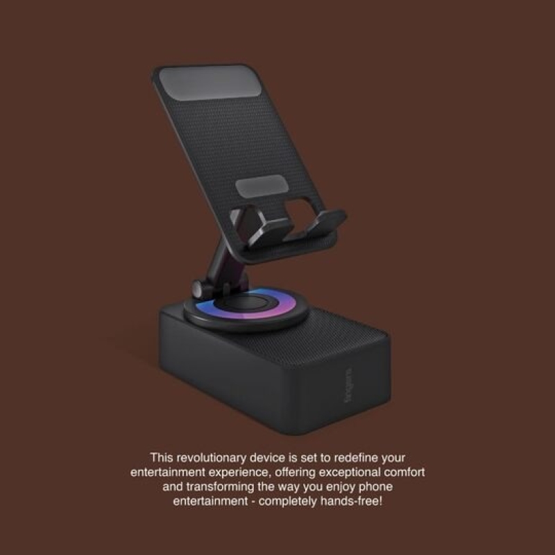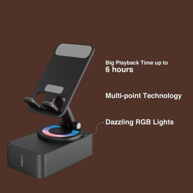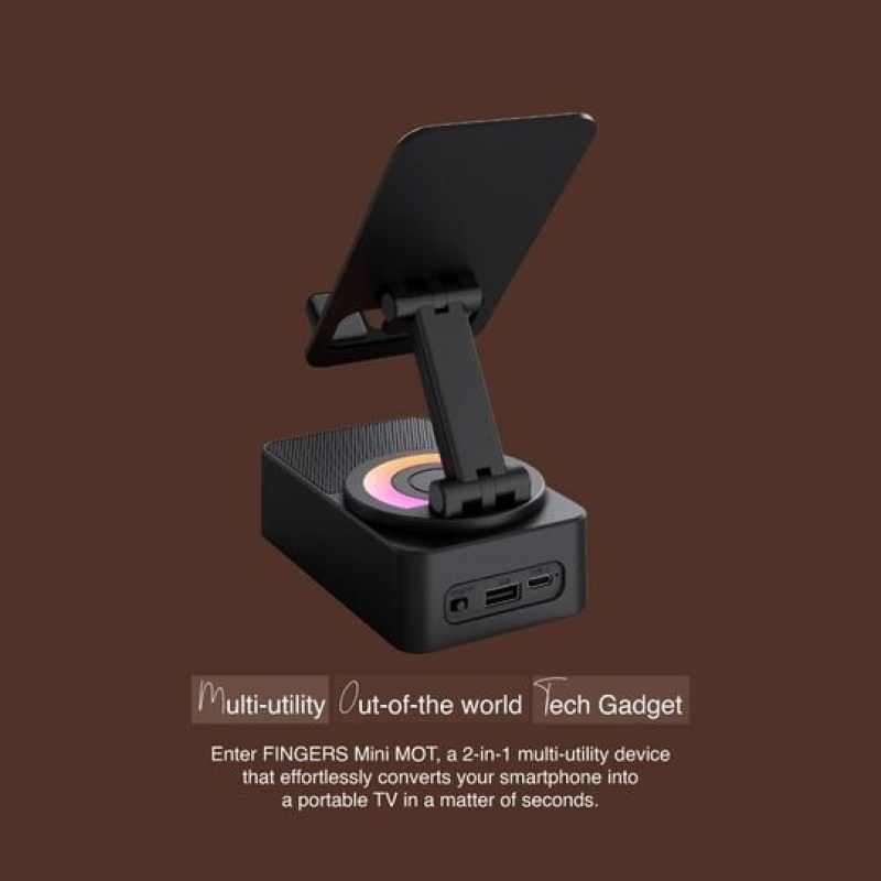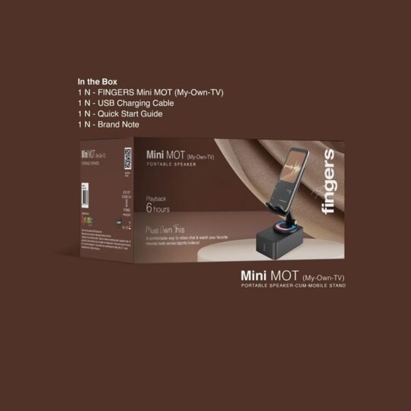 The FINGERS Mini MOT (My-Own-TV) is a compact and innovative portable speaker with a built-in 360° rotating mobile stand, designed to transform your smartphone into a mini entertainment hub. Featuring rich sound, RGB halo lights, a built-in mic for clear video calls, up to 6 hours of playback, and dual-device connectivity, it’s perfect for movies, meetings, cooking videos, gaming, fitness sessions, and more. Lightweight and portable, it delivers hands-free convenience and immersive audio wherever you go.
