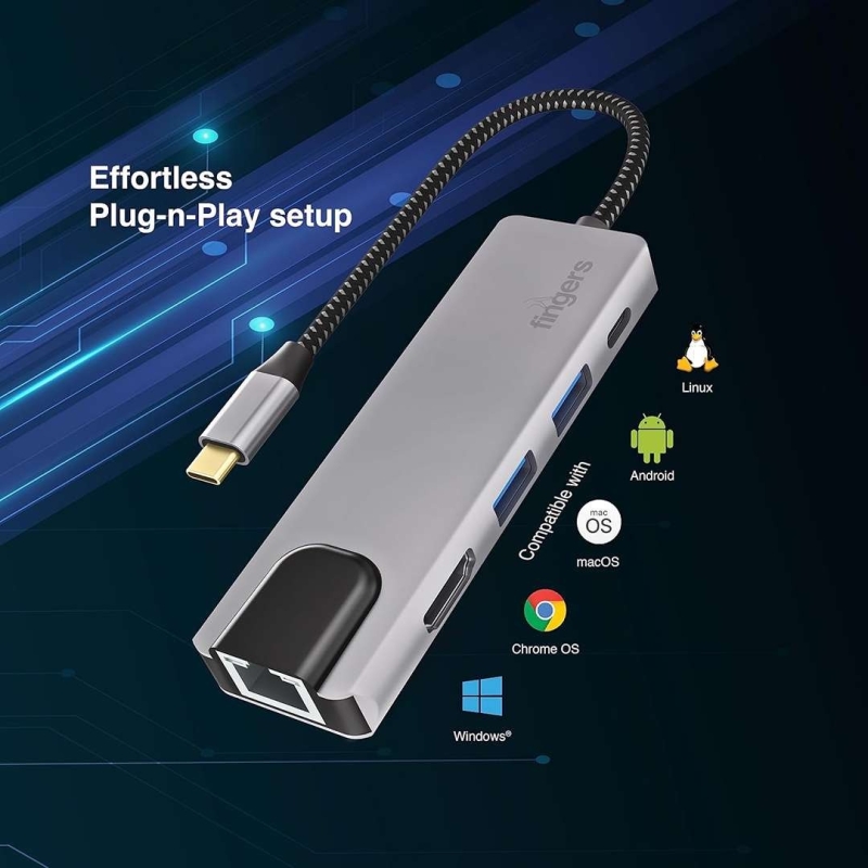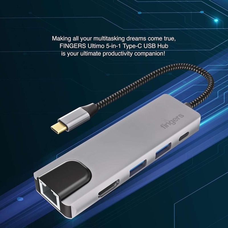 The FINGERS UltimoDock 5-in-1 is a compact and stylish USB Type-C hub in Space Grey, designed to supercharge productivity with five versatile ports. It supports ultra-fast data transfers, 4K HDMI display, Gigabit LAN for reliable internet, and 100W PD charging—all in a sleek, plug-and-play device compatible with laptops and smart TVs.
