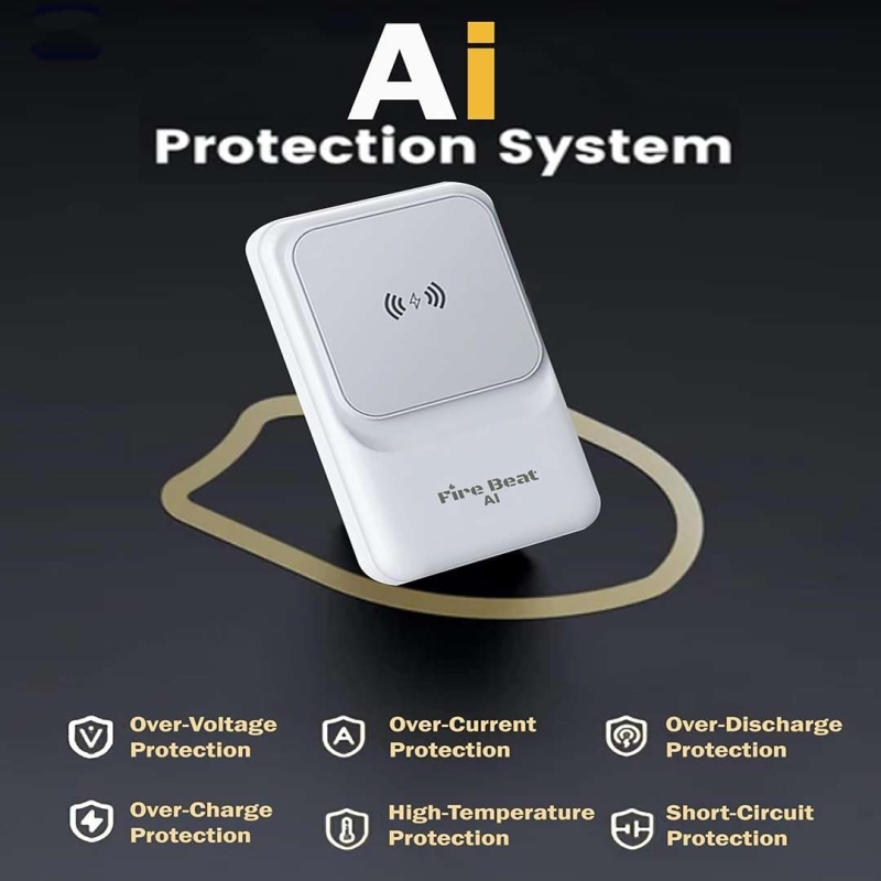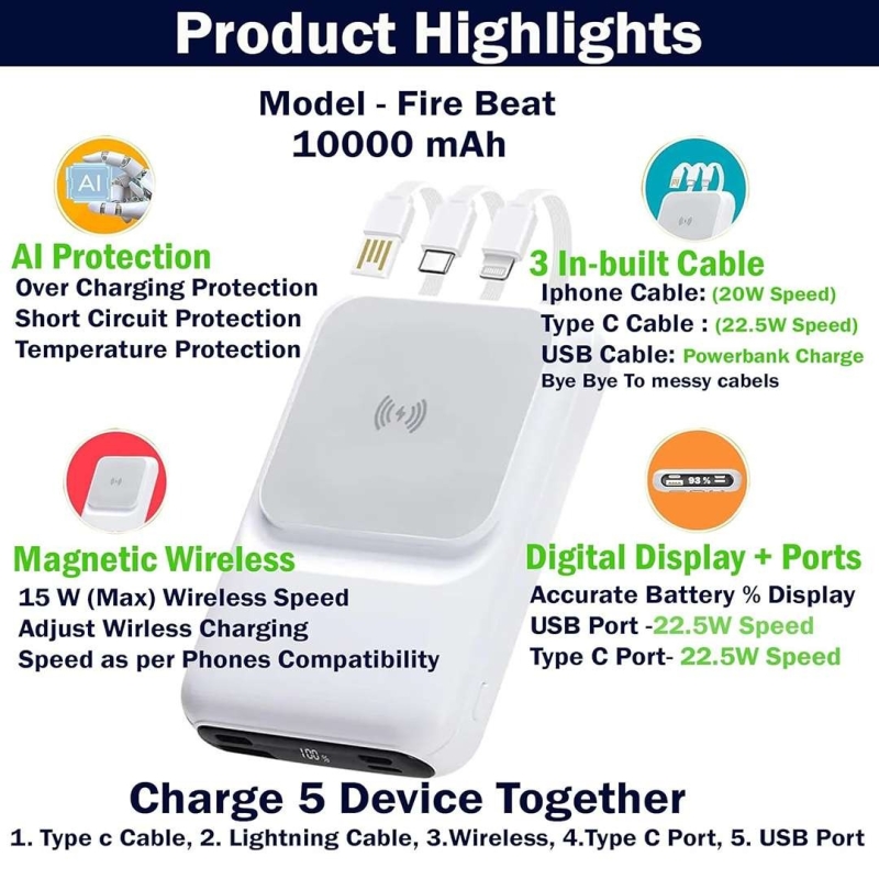 The Fire Beat WLD2 10000mAh Magnetic Wireless Power Bank is a slim, high-capacity portable charger featuring 15W wireless and 22.5W wired fast charging. It supports multiple devices simultaneously, offers AI-powered safety protections, and comes with inbuilt Type-C and Lightning cables for convenient on-the-go charging.