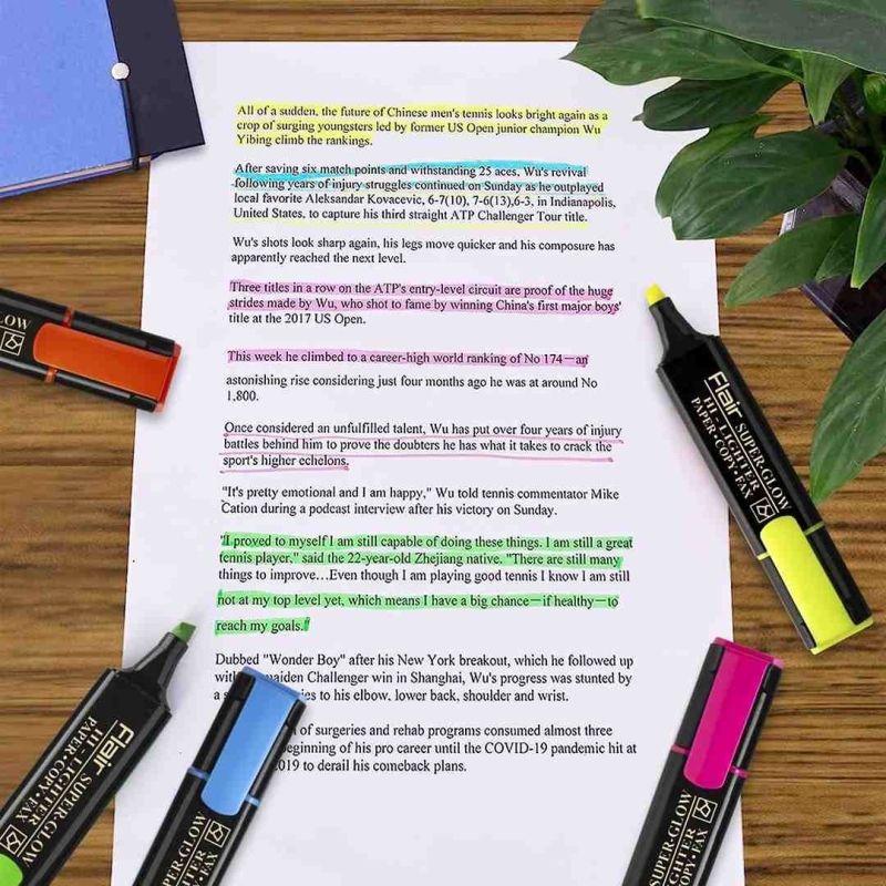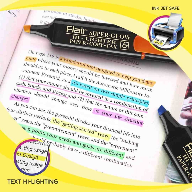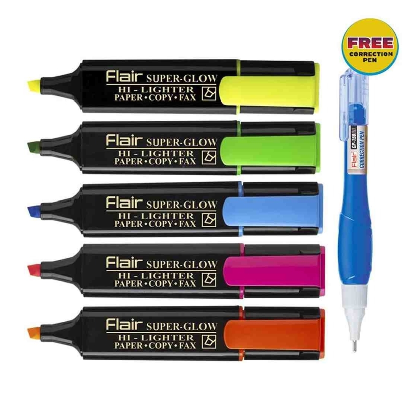 The Flair 5 Shades Super Glow Highlighter pack features five fine-point, multicolor highlighters designed for smooth, flawless writing. Non-toxic ink makes it safe to use on regular and special paper. Each highlighter comes with a convenient pocket clip and click-off cap, perfect for writing, journaling, note-taking, and underlining. Made in India by Flair Writing Industries Ltd, this pack is lightweight and easy to carry.