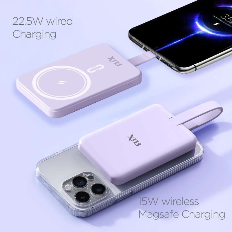 The FLiX UltrCharge XPB-PRO is a stylish 10,000mAh magnetic wireless power bank in purple, designed for fast and convenient charging. With 15W magnetic wireless output, 22.5W fast wired charging, and an inbuilt reversible Type-C to Lightning cable, it is ideal for iPhone 12, 13, and 14 users who need reliable power on the go.