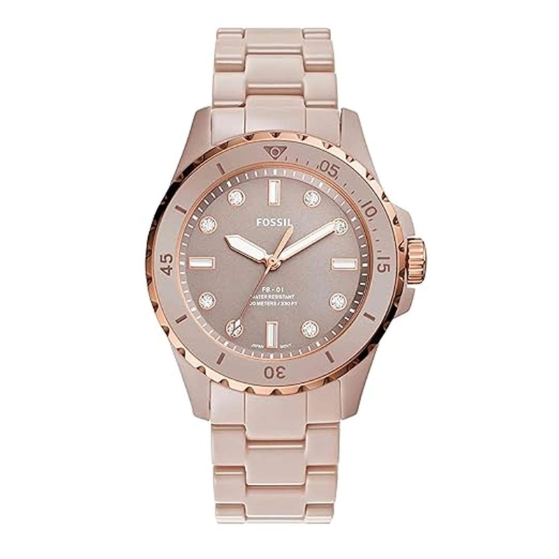 The Fossil FB-01 CE1125 women's analog watch features a bold brown ceramic band and matching dial within a 36mm stainless steel case. Designed for durability and elegance, it offers a quartz movement, 100-meter water resistance, and a sleek chronograph-style look, making it ideal for both daily wear and active lifestyles.