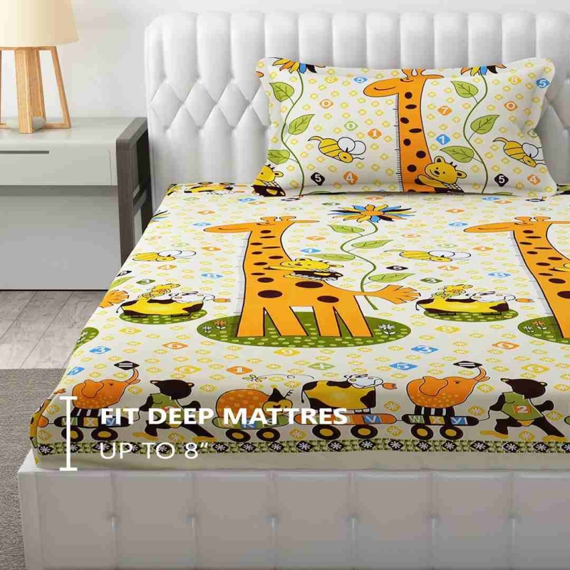 This FRESH FROM LOOM Single Bed Elasticated Fitted Bedsheet features a soft microfiber fabric with a smooth 300 thread count and a playful cartoon print in vibrant yellow. Designed for 36" x 78" mattresses with up to 8-inch thickness, it offers a wrinkle-free, firm fit using an all-around elastic border. The set includes one fitted bedsheet and one standard pillow cover, making it ideal for everyday use, kid’s rooms, and gifting.