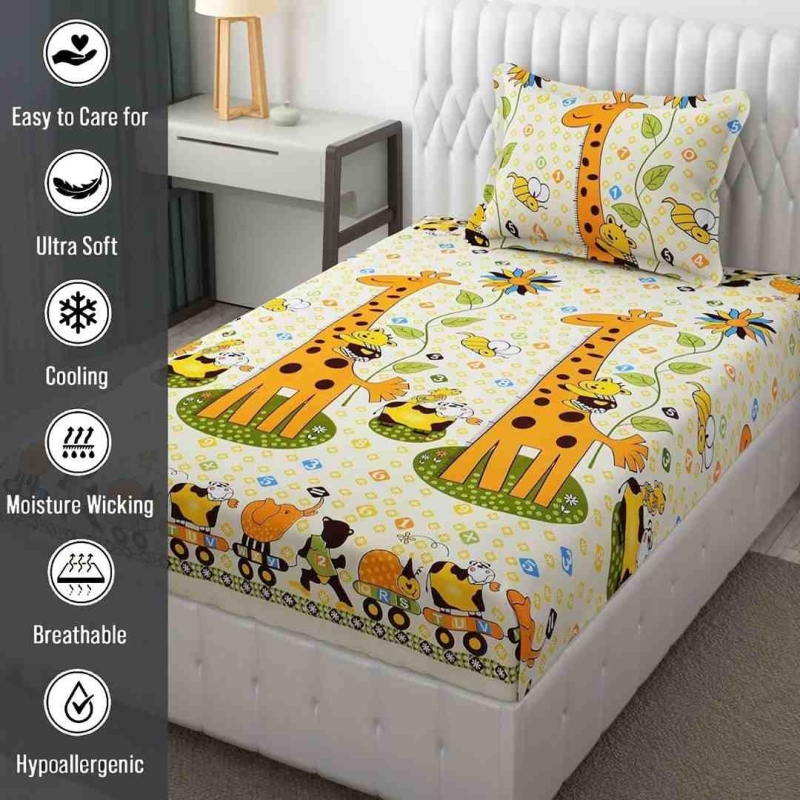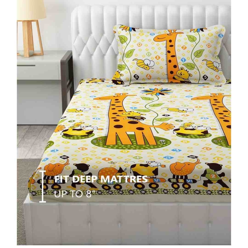 This FRESH FROM LOOM Single Bed Elasticated Fitted Bedsheet features a soft microfiber fabric with a smooth 300 thread count and a playful cartoon print in vibrant yellow. Designed for 36" x 78" mattresses with up to 8-inch thickness, it offers a wrinkle-free, firm fit using an all-around elastic border. The set includes one fitted bedsheet and one standard pillow cover, making it ideal for everyday use, kid’s rooms, and gifting.