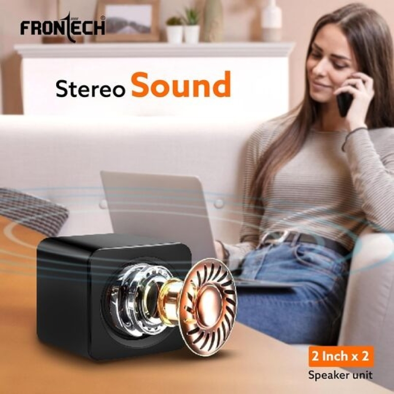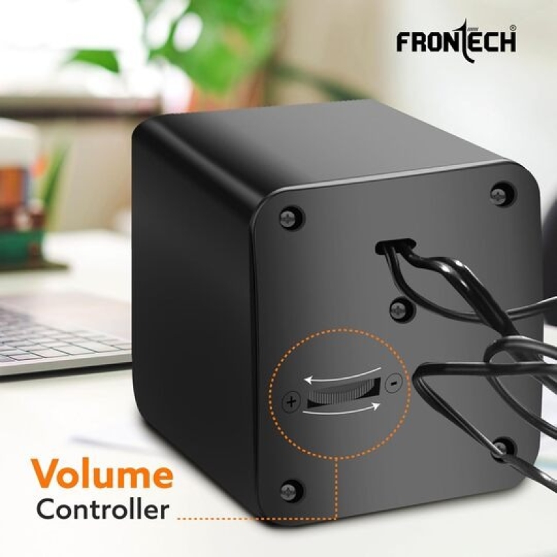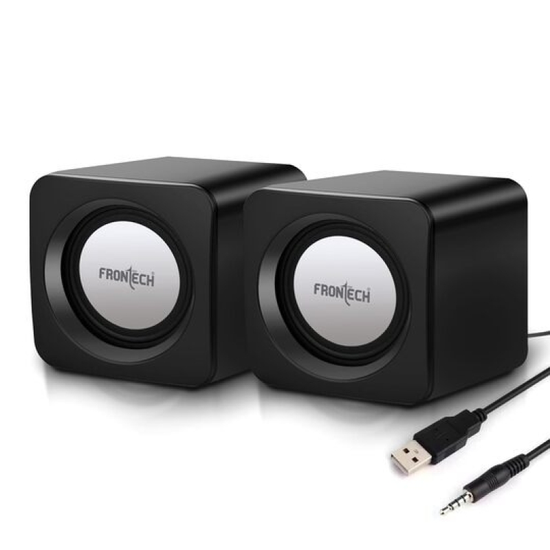 The FRONTECH SPK-0002 PC Speakers are compact 2.0 channel stereo speakers designed for clear everyday audio. Powered via USB with a 3.5mm AUX input, they offer universal compatibility with laptops, desktops, smartphones, and tablets. Their cubic tabletop design, built-in volume control, and lightweight build make them ideal for home, office, and on-the-go use.