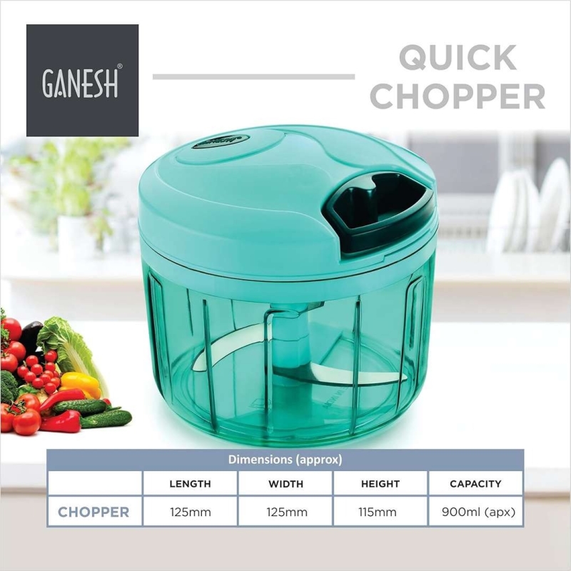 The Ganesh Quick Chopper in Pool Green is a handy manual kitchen tool perfect for chopping vegetables quickly and effortlessly. With curved stainless steel blades, a sturdy plastic body, and dishwasher-safe design, this compact chopper simplifies your food prep with minimal effort.