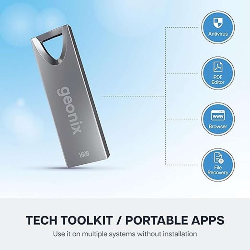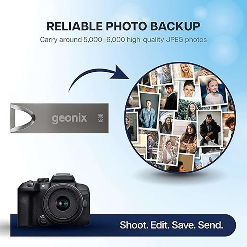 The GEONIX 16GB USB 2.0 Pen Drive features a durable alloy zinc body with a sandblasted metallic finish, offering strong protection against water, dust, and impact. Its lightweight, compact design makes it ideal for everyday use and perfect for attaching to keyrings. With up to 60MB/s read speed, it provides reliable performance for storing and transferring essential data.