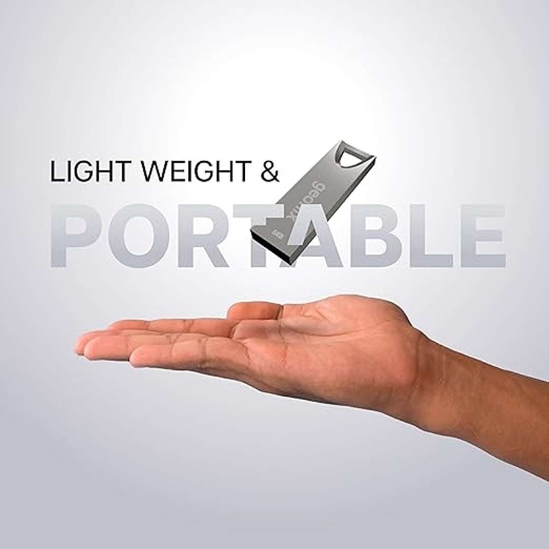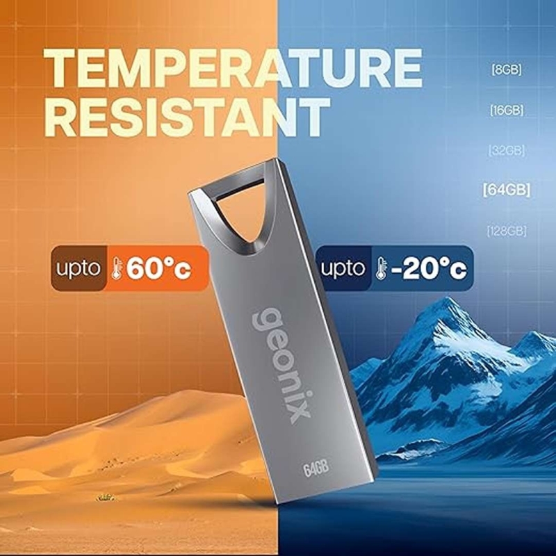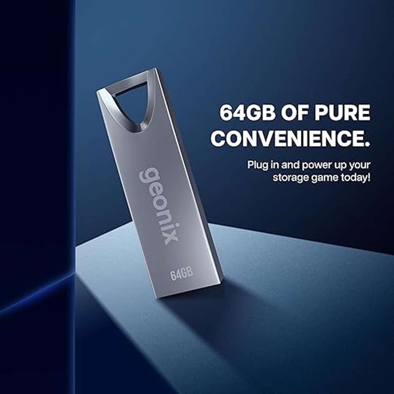 The GEONIX 64GB USB 2.0 Pen Drive offers reliable, high-capacity storage in a robust alloy zinc body with a sandblasted metallic finish. Its dust-proof, water-resistant, and shock-resistant design ensures durability, while the lightweight, compact form factor makes it perfect for keyrings and portable use. Compatible with computers, laptops, smartphones, and tablets.