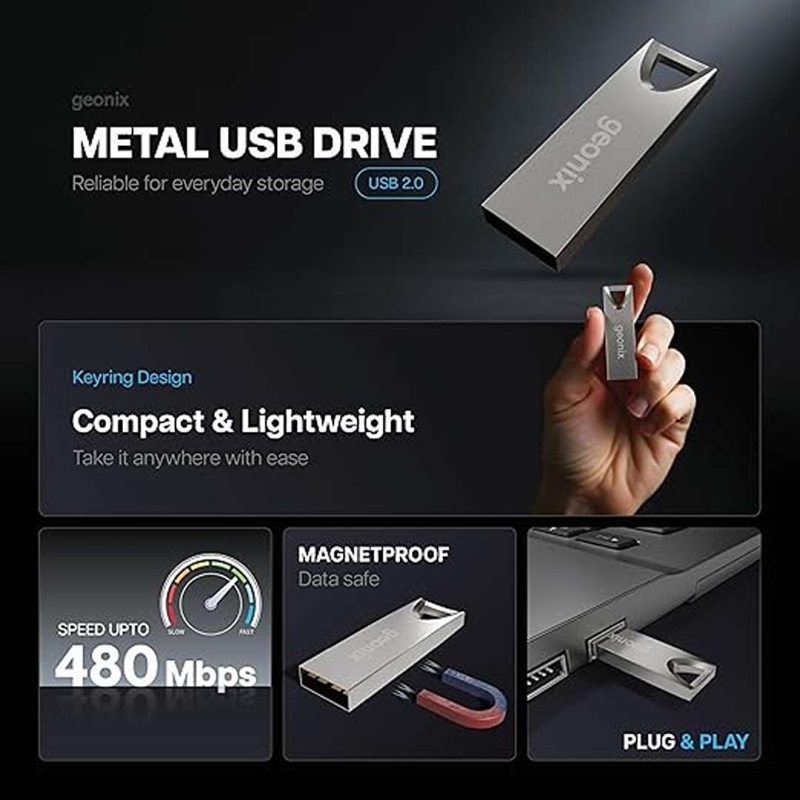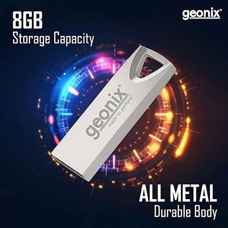 The GEONIX 8GB USB 2.0 Pendrive is a compact, lightweight, and durable storage device designed with a robust alloy zinc body and sandblasted metallic finish. It offers reliable protection against water, dust, and impact, making it ideal for everyday use. Built with a keyring-friendly design, this pendrive ensures convenient portability along with stable read speeds and long-lasting performance.