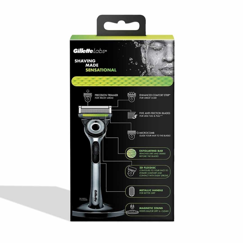 The Gillette Labs Razor with Exfoliating Bar features advanced 2D Flexdisc Technology that adapts to the contours of your face, ensuring maximum comfort and consistent contact with every stroke. Its premium metallic handle offers superior grip, while the included magnetic stand keeps the razor dry, clean, and always ready to use. Designed with a built-in exfoliating bar, it removes dirt and debris before the blades touch your skin—delivering a smoother and more efficient shaving experience.