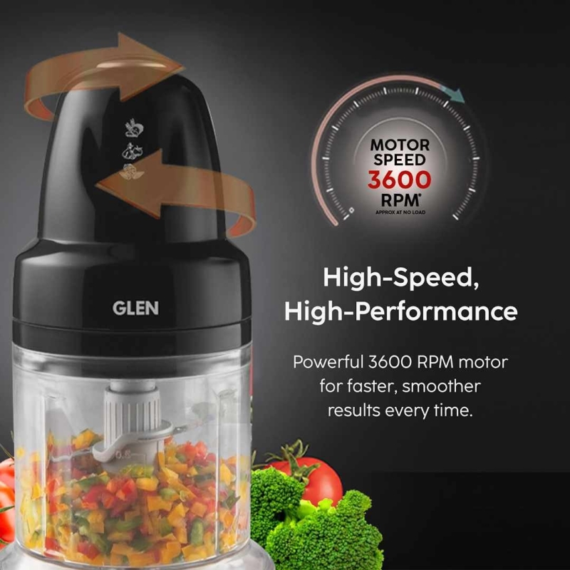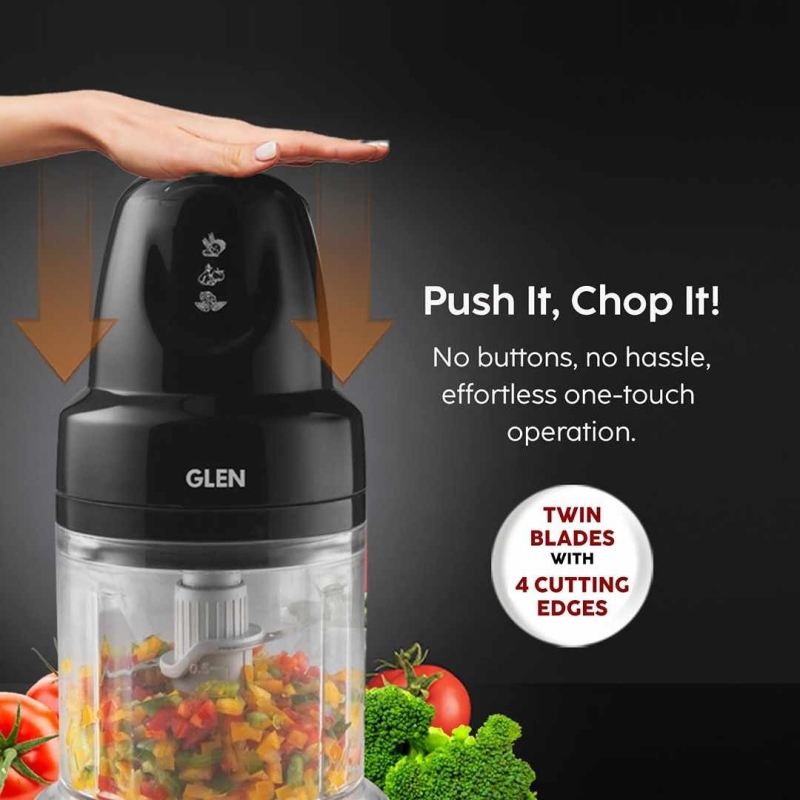The Glen SA4043TUBLK Electric Chopper is a practical and compact 200W kitchen appliance with a 500ml bowl ideal for daily chopping, mincing, and whisking tasks. It features twin rust-resistant stainless steel blades with 4 cutting edges, a whisking disc, and a one-push button for quick operation. With a stable anti-skid base and easy-clean design, it's built to simplify your food prep routine.