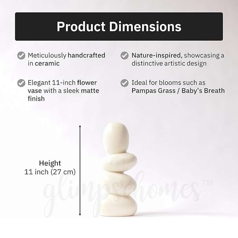 This Glimpse Homes cylindrical ceramic vase features a contemporary matte finish that mimics the natural texture of pebbles. Standing at 27 cm tall, its unique and innovative design adds elegance to any living room décor. Perfect for indoor use, it can hold fresh or dried flowers or serve as a standalone statement piece. Available in Ivory White, this vase combines functionality with artistic style.