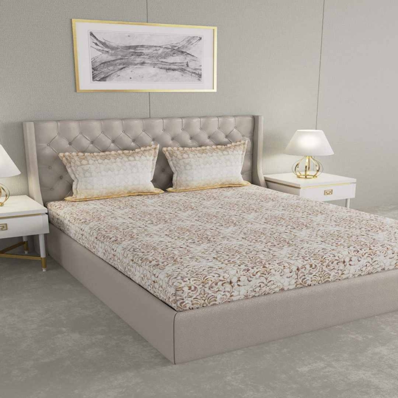 The GMF King Size Digital Print Bedsheet Set is crafted from soft and durable cotton, featuring a modern botanical design in white and brown tones. Designed for all-season comfort, this breathable and skin-friendly bedsheet offers a luxurious feel and a stylish look for any bedroom. The set includes a spacious 108 x 108 inch bedsheet and two pillow shams, made with high-quality fabric and detailed digital printing for lasting elegance. Ideal for everyday use or gifting on special occasions.