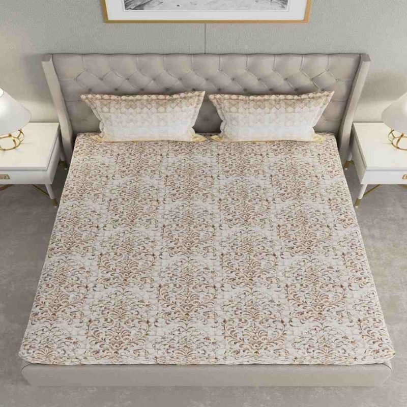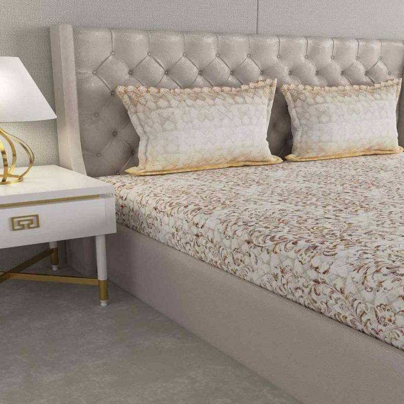The GMF King Size Digital Print Bedsheet Set is crafted from soft and durable cotton, featuring a modern botanical design in white and brown tones. Designed for all-season comfort, this breathable and skin-friendly bedsheet offers a luxurious feel and a stylish look for any bedroom. The set includes a spacious 108 x 108 inch bedsheet and two pillow shams, made with high-quality fabric and detailed digital printing for lasting elegance. Ideal for everyday use or gifting on special occasions.