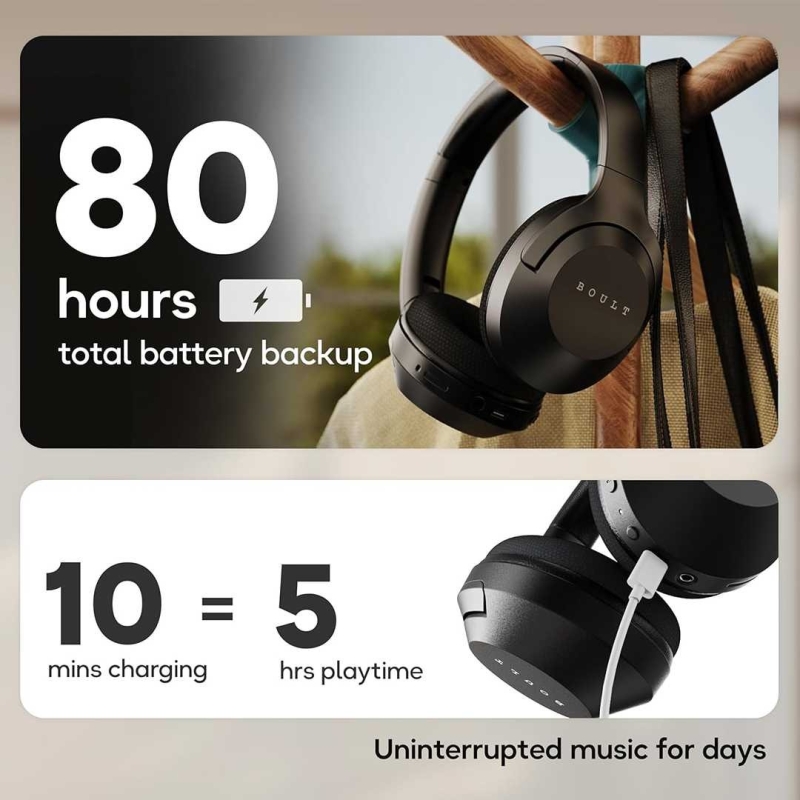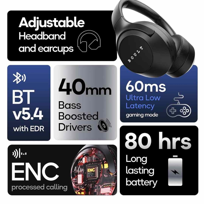 Step into superior sound with the Boult Flex Wireless Headphones, engineered for 80 hours of playtime, powerful 40mm bass drivers, and Zen™ ENC mic for crystal-clear calls. Equipped with Bluetooth 5.4, Dual Device DSP, 4 EQ modes, and IPX5 rating, it’s built for your workout, commute, or gaming sessions. Stay connected in style with seamless wireless performance and an optional AUX input.