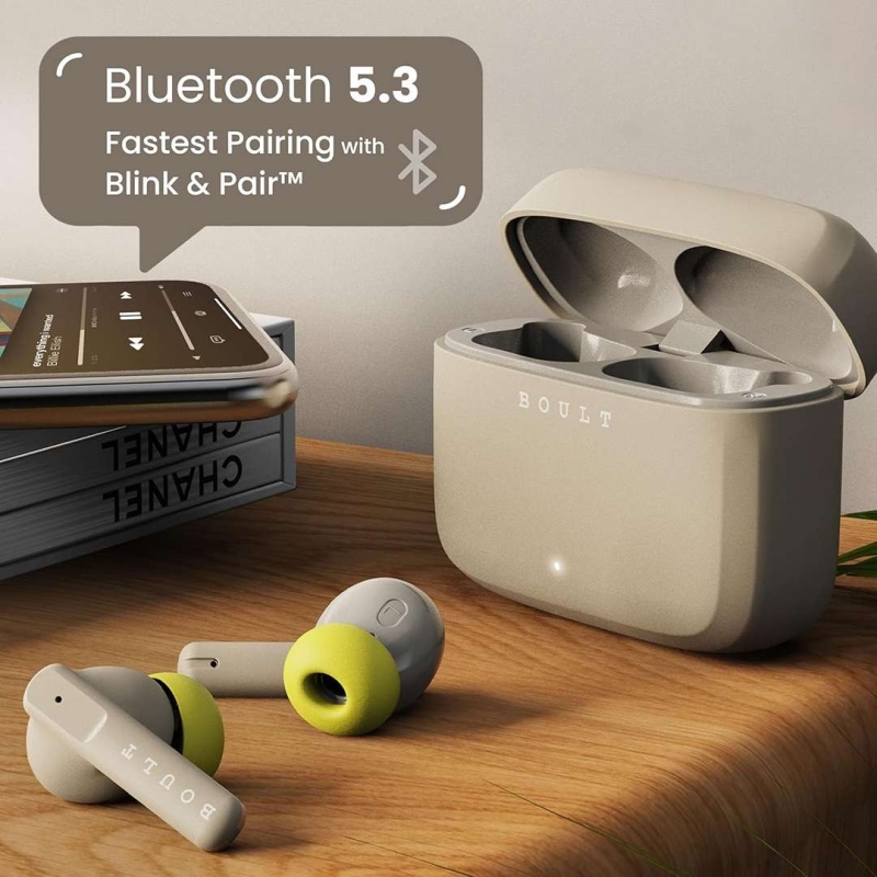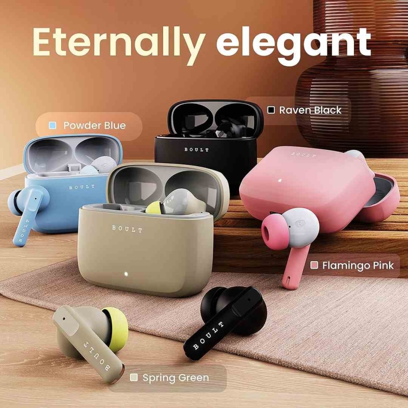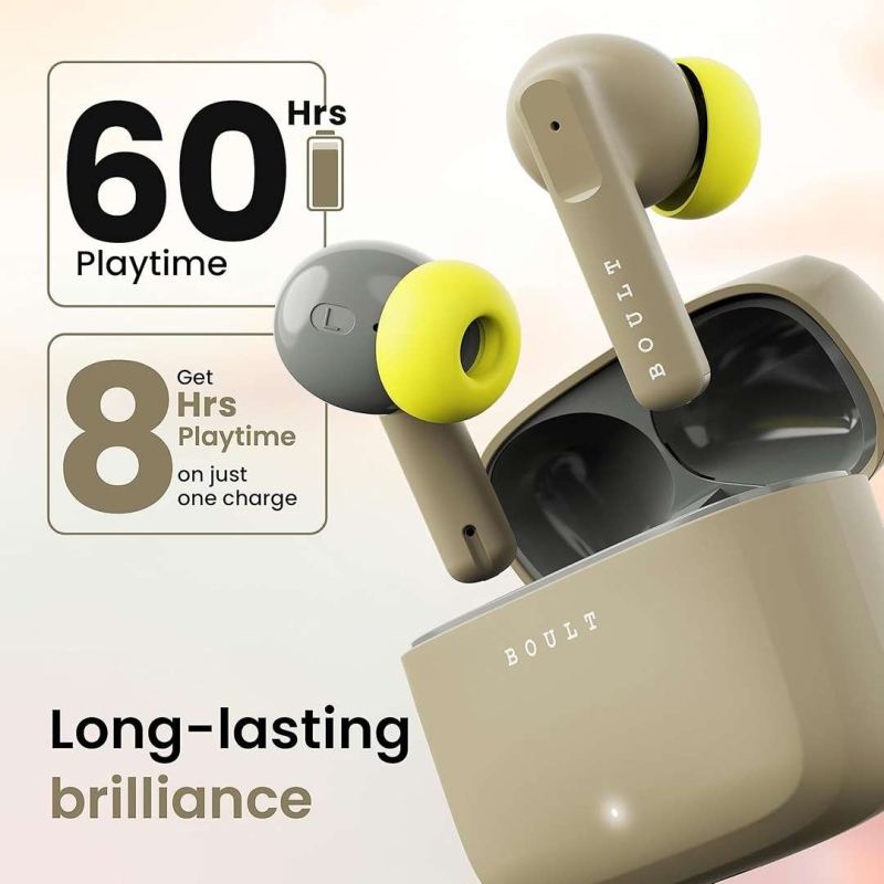 Experience style and sound with the Boult Z60 TWS Earbuds in elegant Spring Green. Engineered with 60 hours of total playtime, quad-mic ENC for crystal-clear calls, 50ms low latency for gaming, and powerful 13mm bass drivers, these earbuds are designed for performance and flair. With Bluetooth 5.3, Type-C fast charging, IPX5 water resistance, and intuitive touch controls, these Made in India earbuds are perfect for music, gaming, and on-the-go communication.