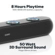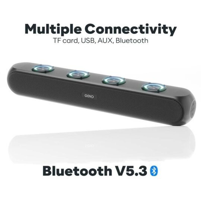 The GOVO Gosurround 320 is a powerful 50W portable mini soundbar designed to deliver immersive 3D surround sound for movies, gaming, music, and parties. Equipped with Bluetooth 5.3, dynamic RGB LED lights, and a 4000mAh battery offering up to 8 hours of playback, it combines performance with style. Multiple connectivity options like USB, AUX, TF Card, and FM ensure flexible usage across devices such as TVs, laptops, and smartphones.