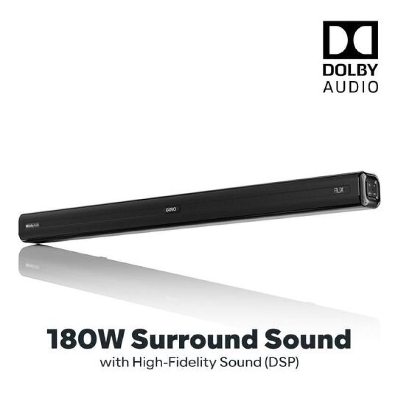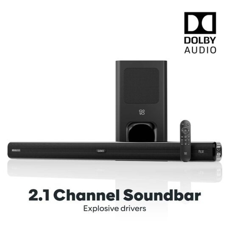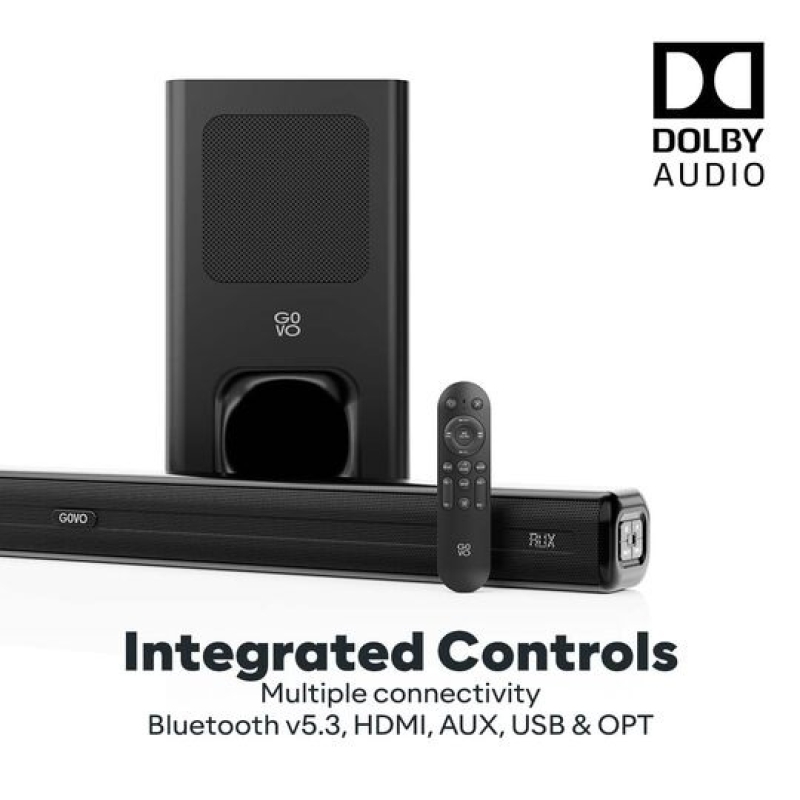 The GOVO Gosurround 800 is a powerful 180W 2.1 channel Dolby Audio soundbar designed to deliver an immersive home-theatre experience. Featuring 4 high-performance speakers and a 5.25" DSP-enabled wired subwoofer, it offers deep bass, clear vocals, and dynamic surround sound. With HDMI ARC, Optical, USB, AUX, and Bluetooth 5.3, along with wall or tabletop mounting, it blends premium audio performance with a sleek, modern design.